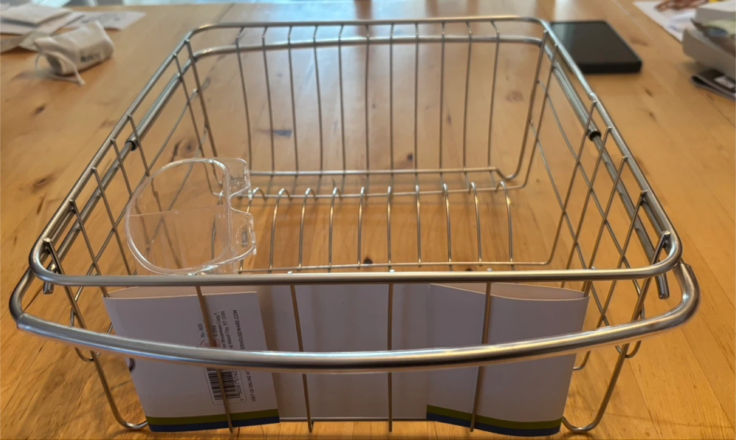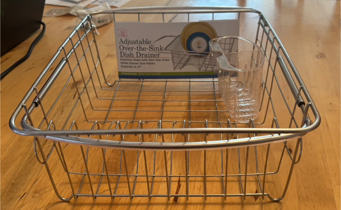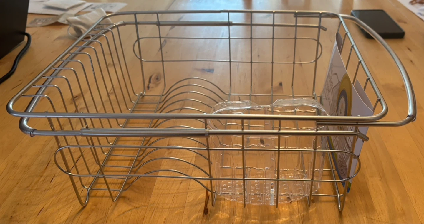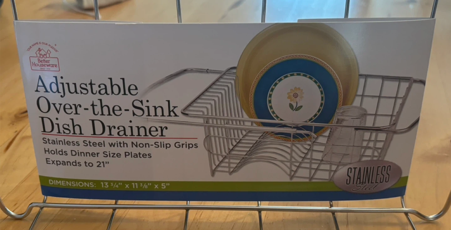 Selling a Better Houseware adjustable over-the-sink dish drainer. It's made of stainless steel with non-slip grips and holds dinner size plates. It expands to 21" and the dimensions are 13 3/4" x 11 1/8" x 5"
