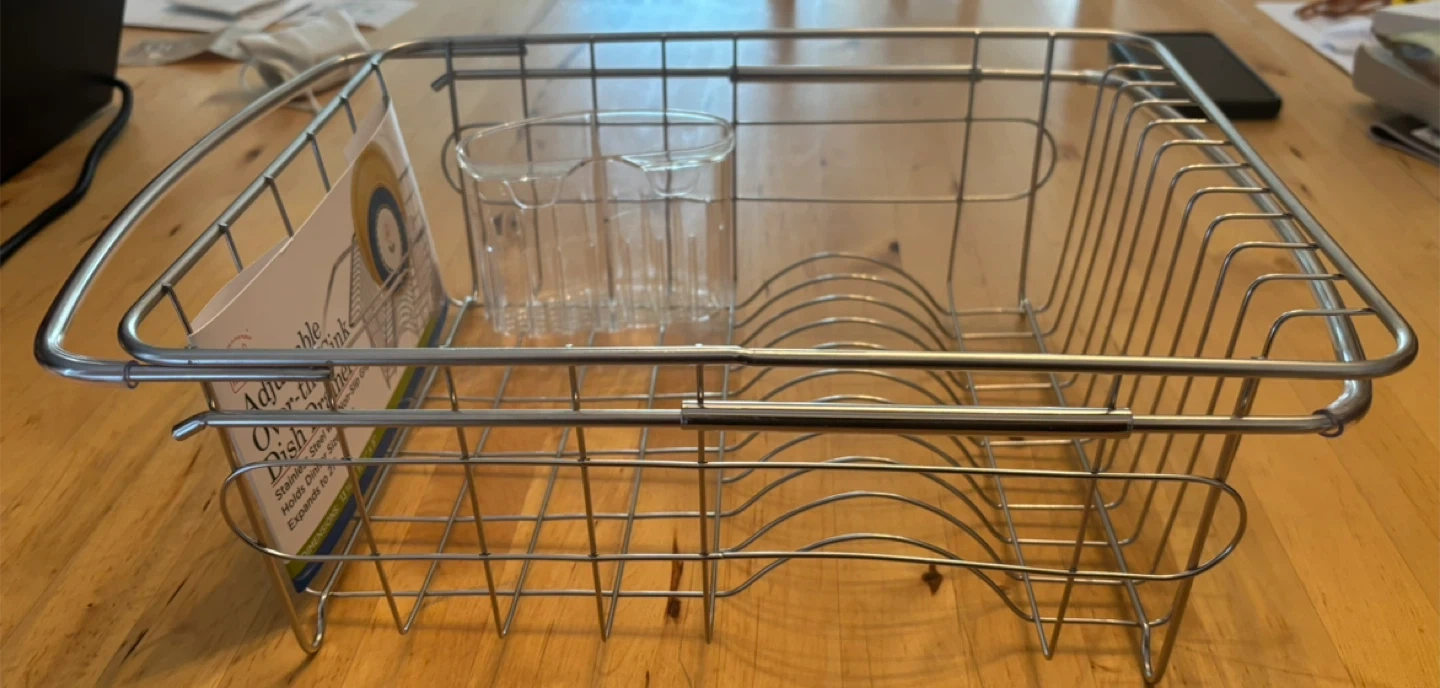 Selling a Better Houseware adjustable over-the-sink dish drainer. It's made of stainless steel with non-slip grips and holds dinner size plates. It expands to 21" and the dimensions are 13 3/4" x 11 1/8" x 5"