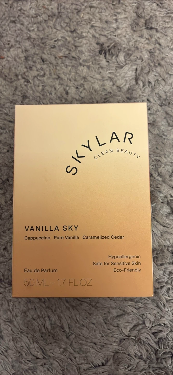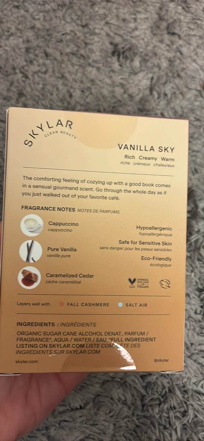 Selling a bottle of Skylar Vanilla Sky Eau de Parfum. It's a rich, creamy, warm scent that layers well with Fall Cashmere and Salt Air. The fragrance notes include cappuccino, pure vanilla, and caramelized cedar. It's hypoallergenic, safe for sensitive skin, and eco-friendly. The bottle contains 50 mL - 1.7 FL OZ