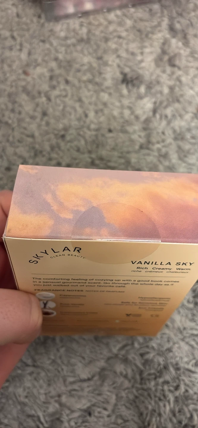 Selling a bottle of Skylar Vanilla Sky Eau de Parfum. It's a rich, creamy, warm scent that layers well with Fall Cashmere and Salt Air. The fragrance notes include cappuccino, pure vanilla, and caramelized cedar. It's hypoallergenic, safe for sensitive skin, and eco-friendly. The bottle contains 50 mL - 1.7 FL OZ