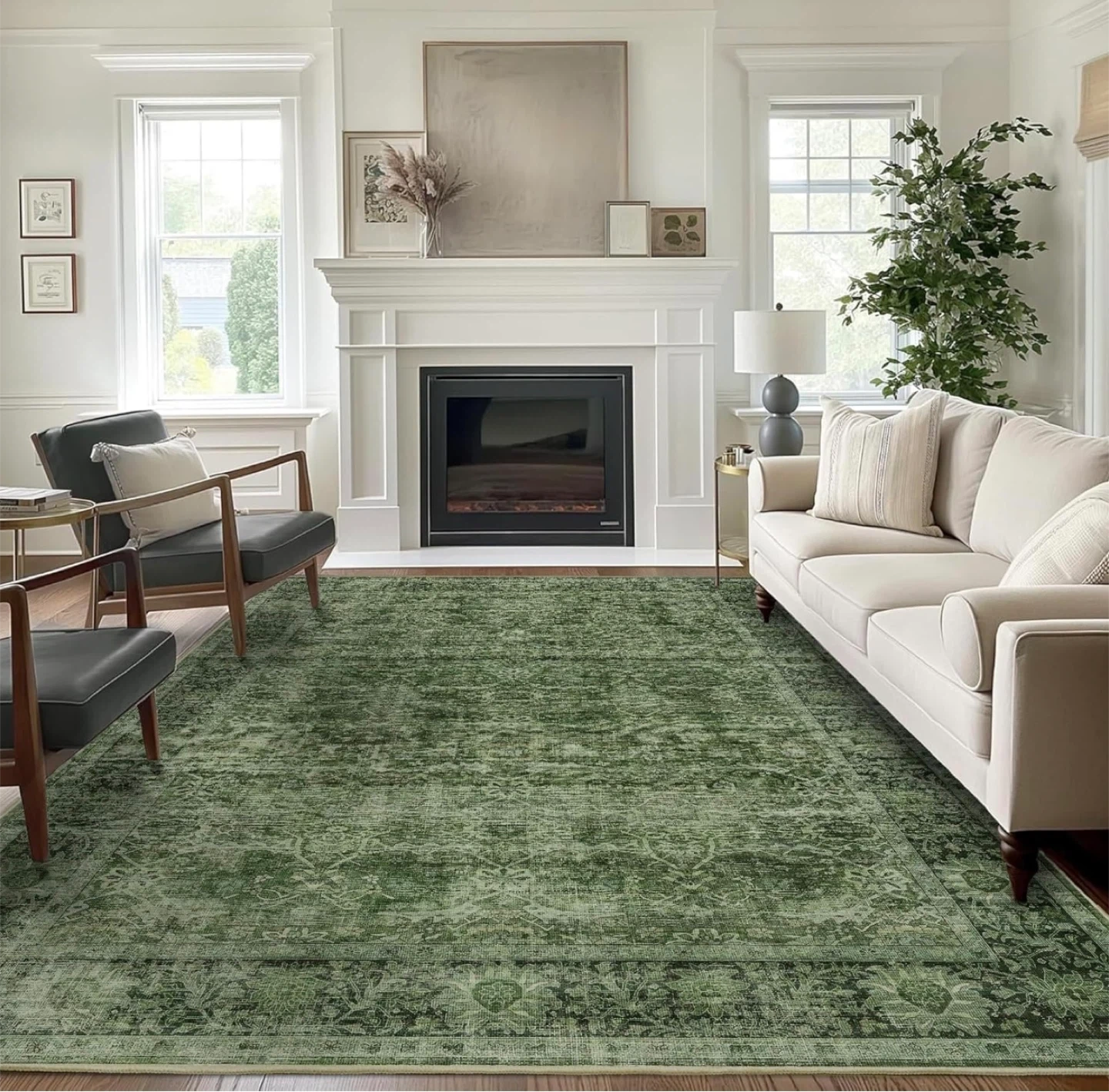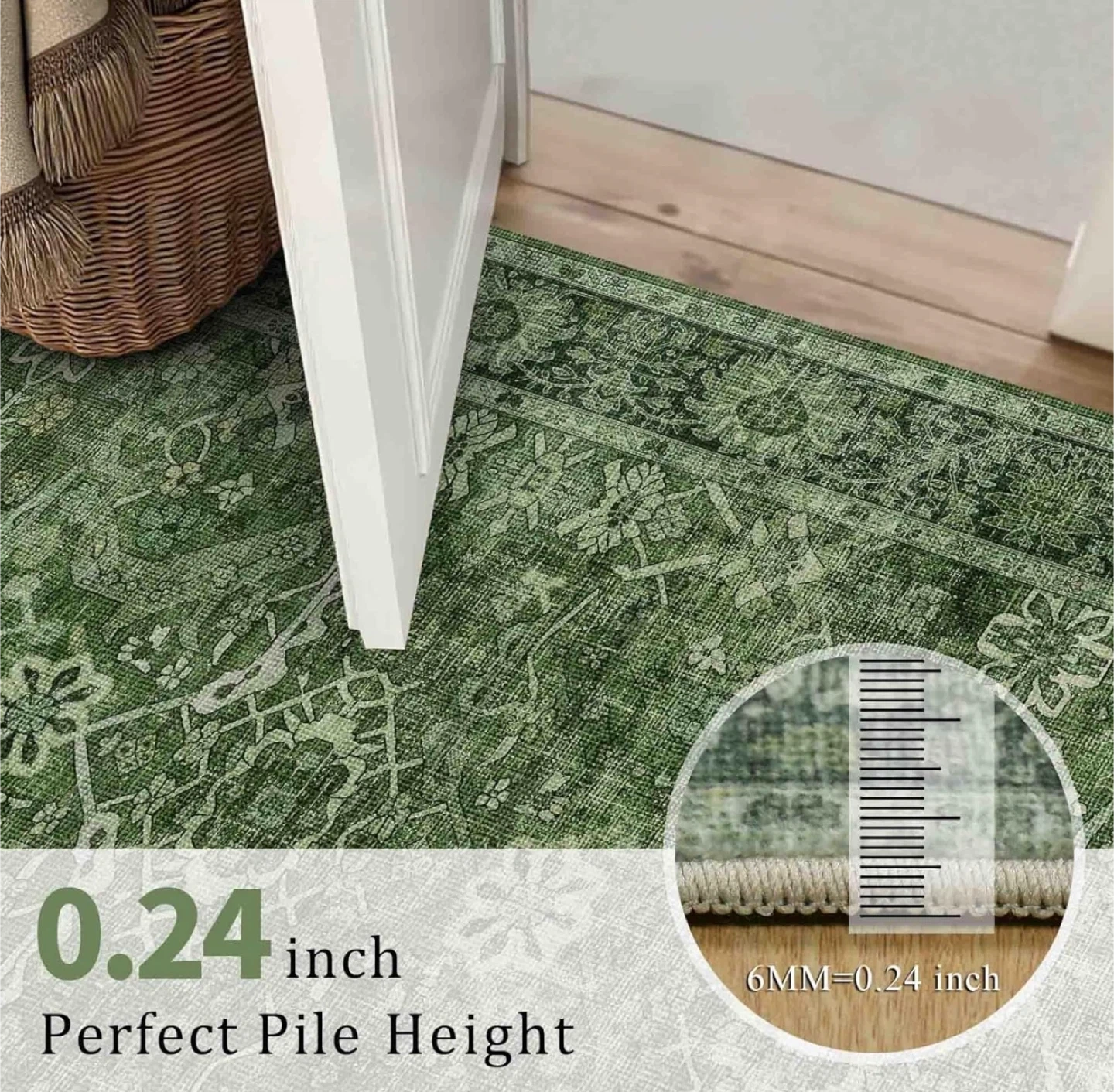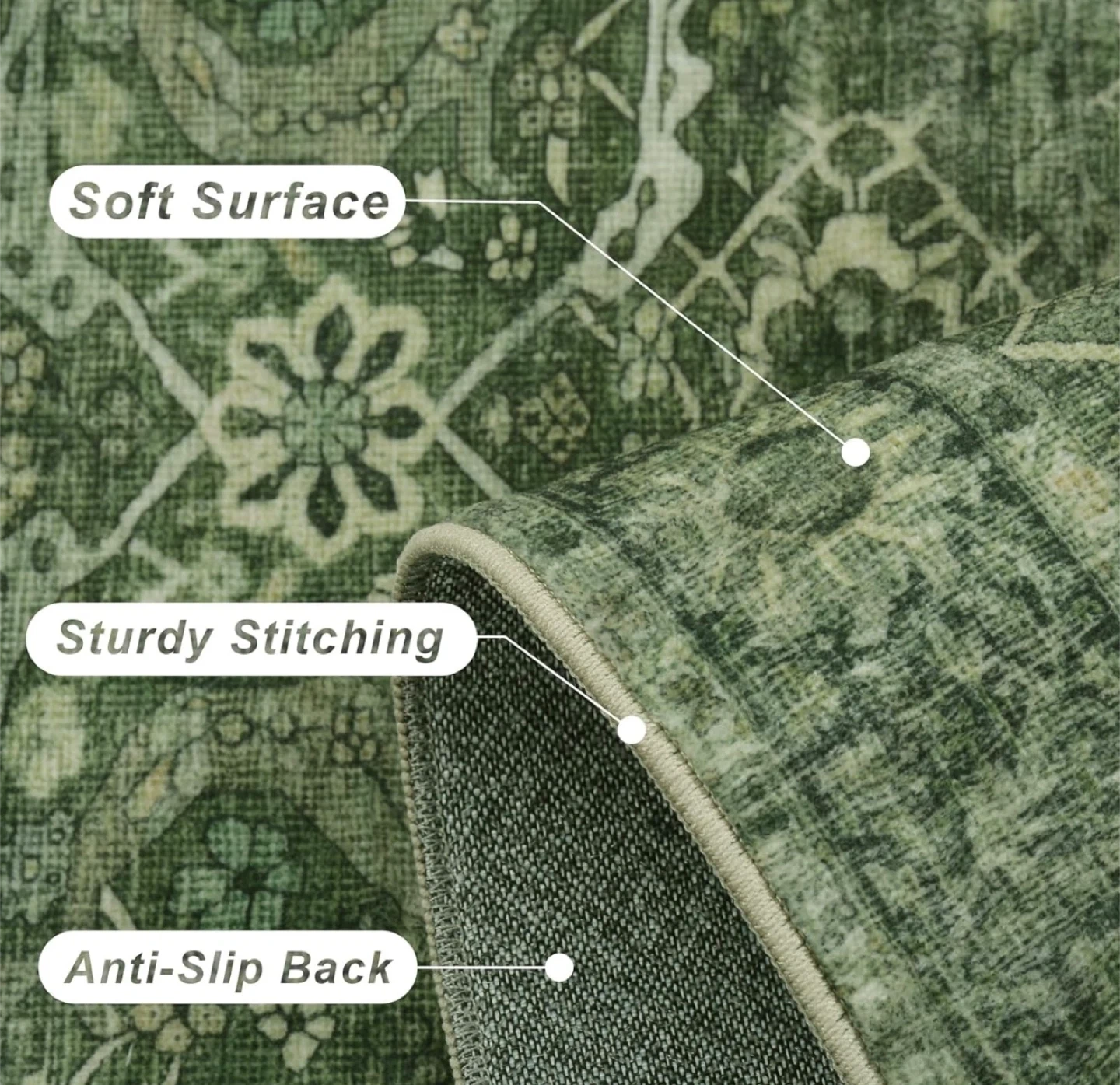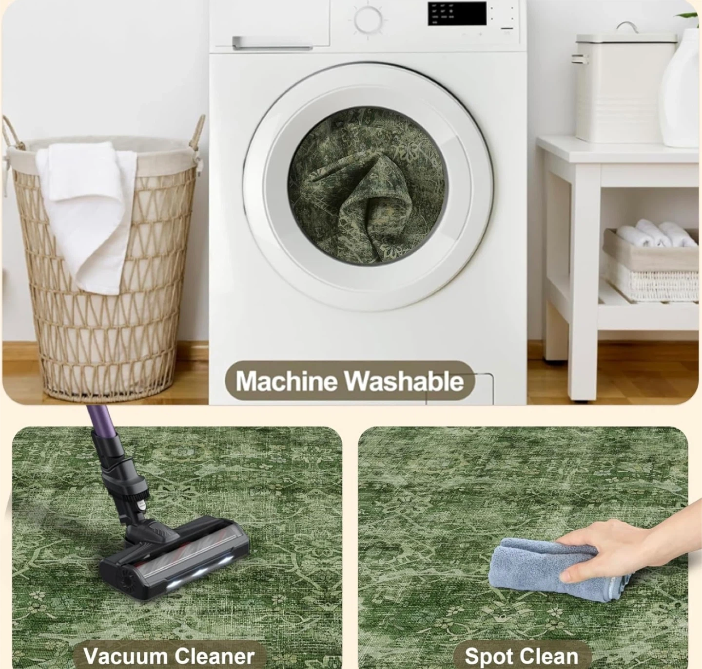 This brand new 5x7 green washable rug features a distressed traditional pattern, perfect for adding a touch of vintage charm to any room. The rug is machine washable for easy care and maintenance, making it ideal for high-traffic areas or homes with kids and pets. This rug offers a soft surface, sturdy stitching, and an anti-slip back. It's the perfect blend of style and practicality.