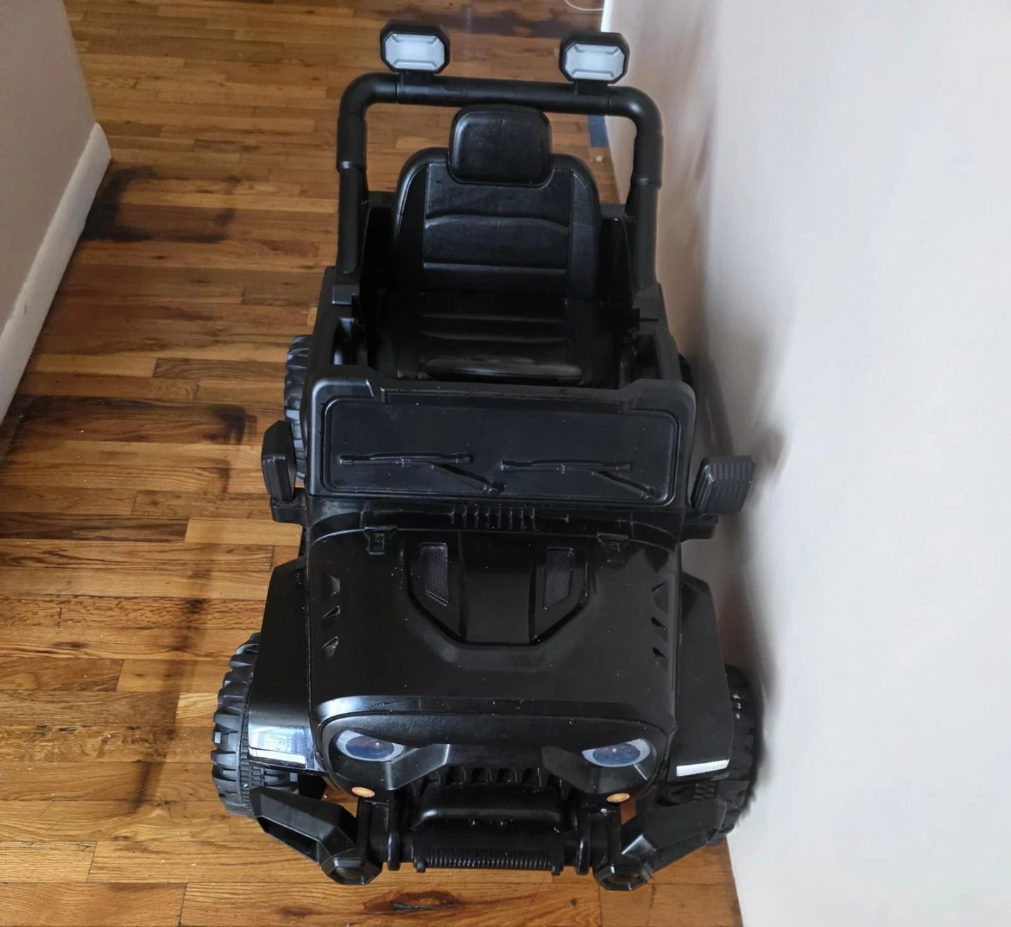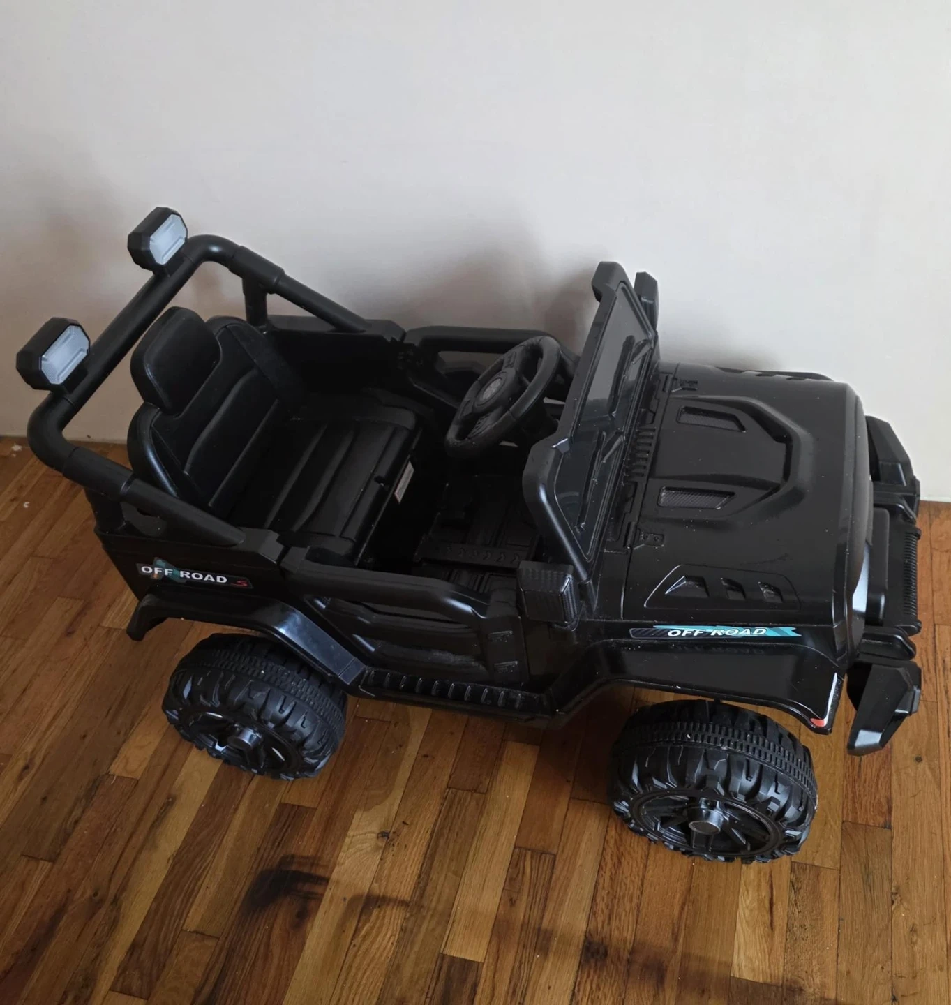 Here's a fun black ride-on jeep for kids! It's perfect for little adventurers who want to explore. It's in good condition and ready for a new driver