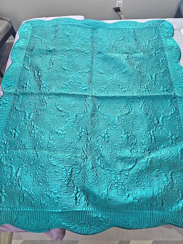 Beautiful teal blue-green quilted satin throw blanket. Like new. Only ever used as decor, not as bedding. Pet free, smoke free home.