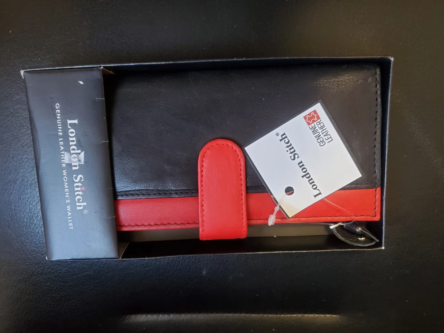 Selling a brand new London Stitch genuine leather women's wallet! It comes in its original box and features a stylish black and red design. Perfect for keeping your essentials organized with a touch of elegance