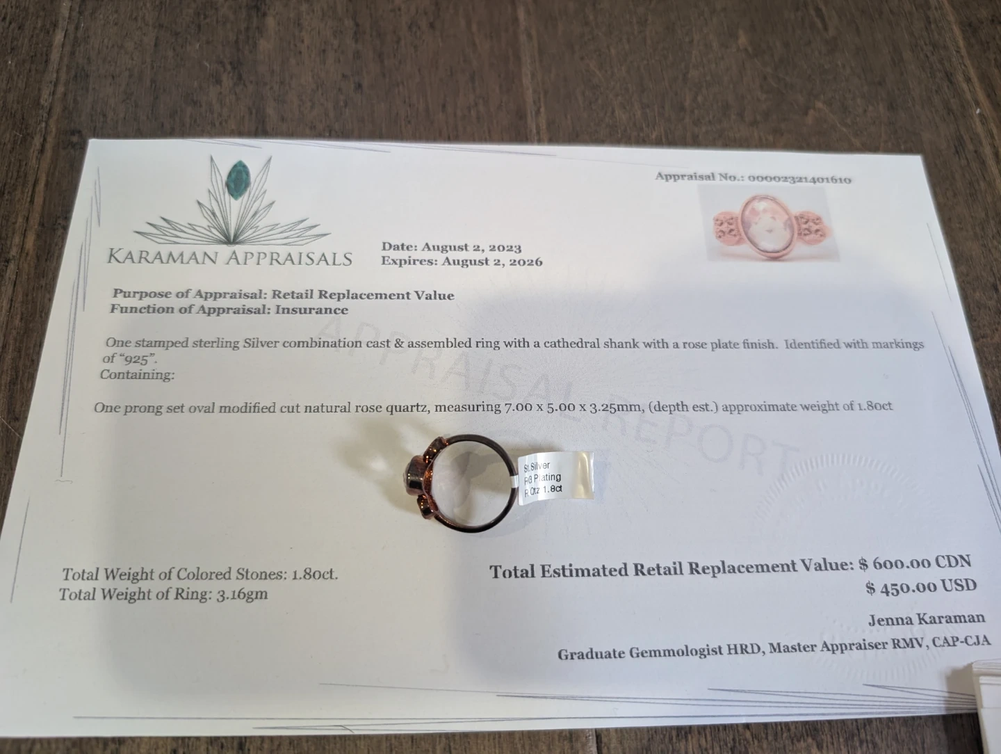 Brand new 925 sterling silver cathedral shank rose quartz ring for sale. One prong set oval modified cut natural genuine rose quartz stone, 1.80ct carats. Ring size 7, retail value $600, selling for $180 FIRM. Comes with appraisal, made in Canada.