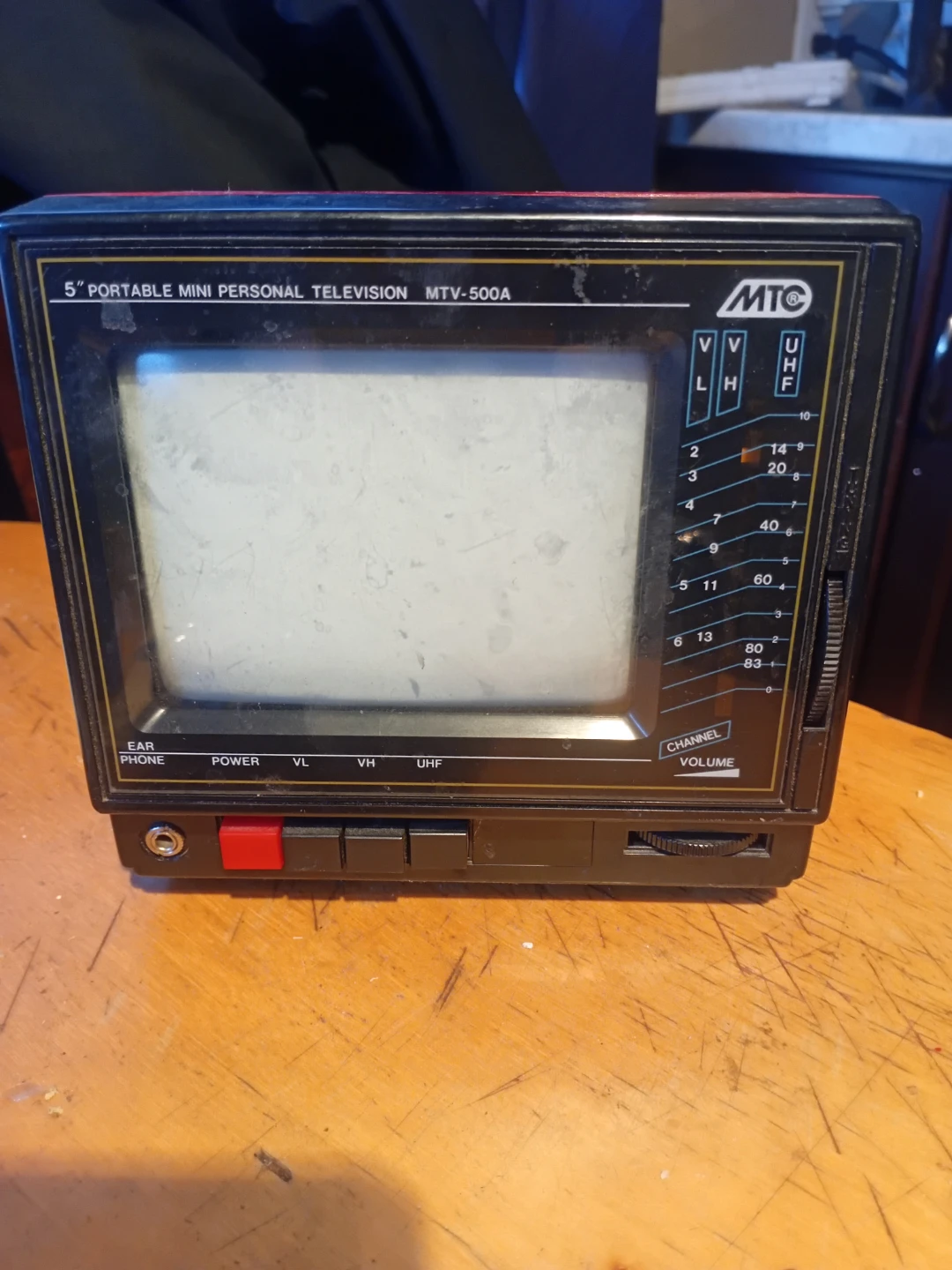 Selling a vintage MTC 5" portable mini personal television, model MTV-500A. It has controls for power, volume, and channel selection.