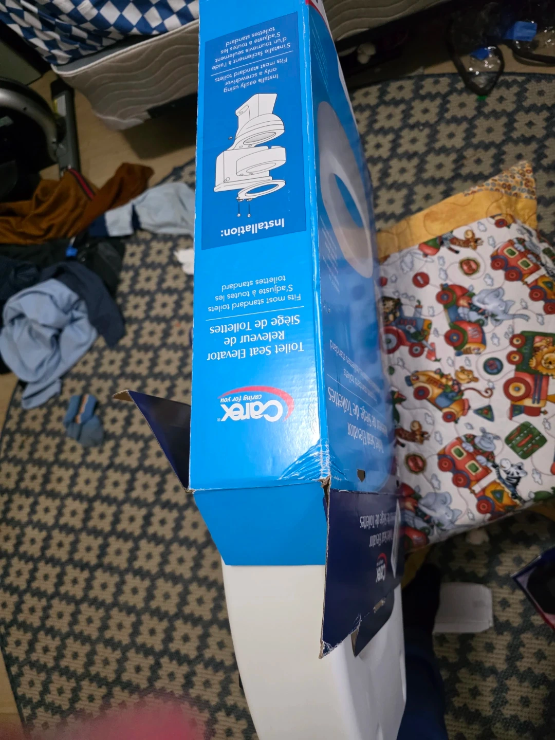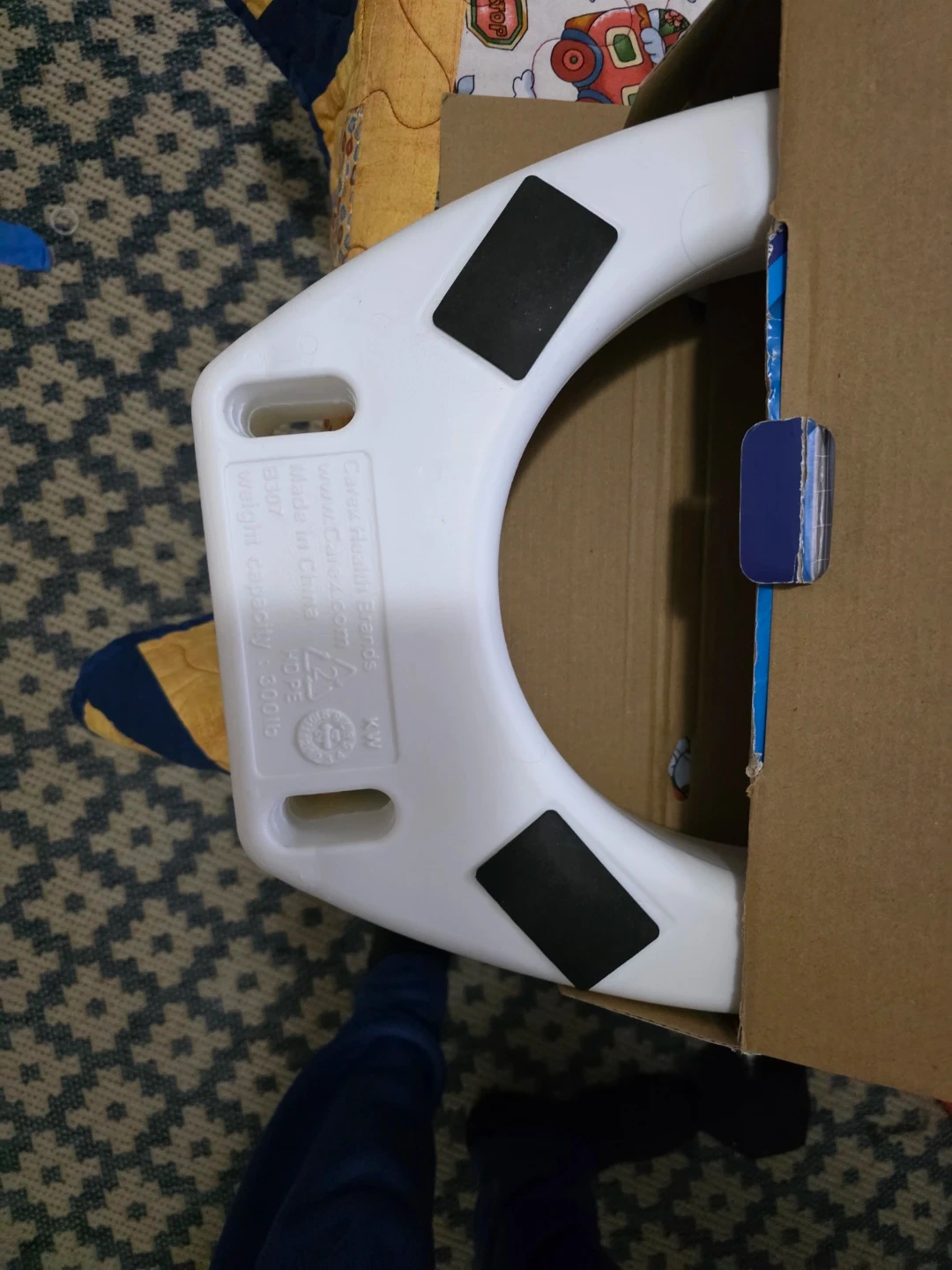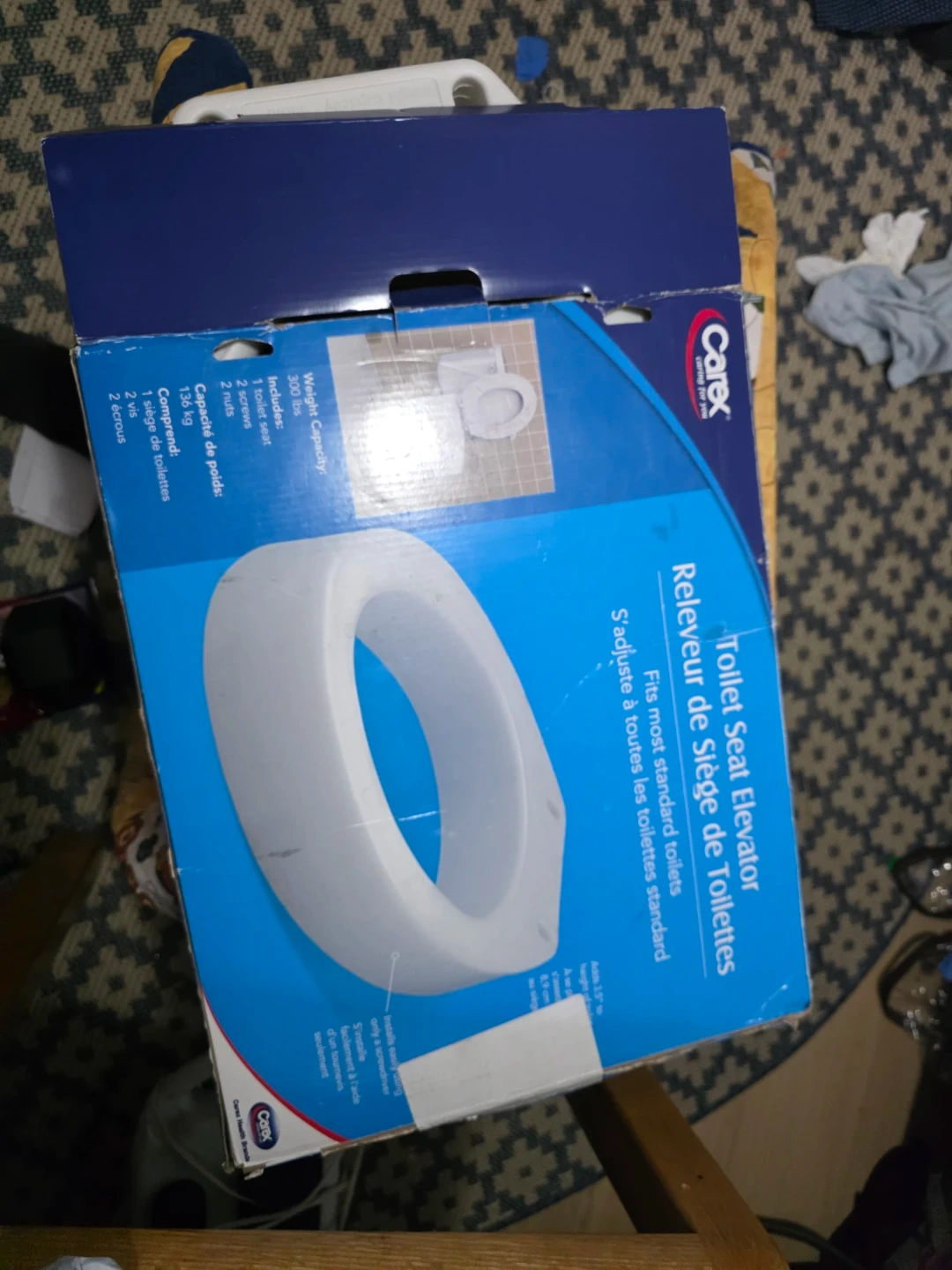 Selling a brand new Carex Toilet Seat Elevator in its original box! It fits most standard toilets and includes the necessary installation parts: 2 screws and 2 nuts. It has a weight capacity of 300 lbs