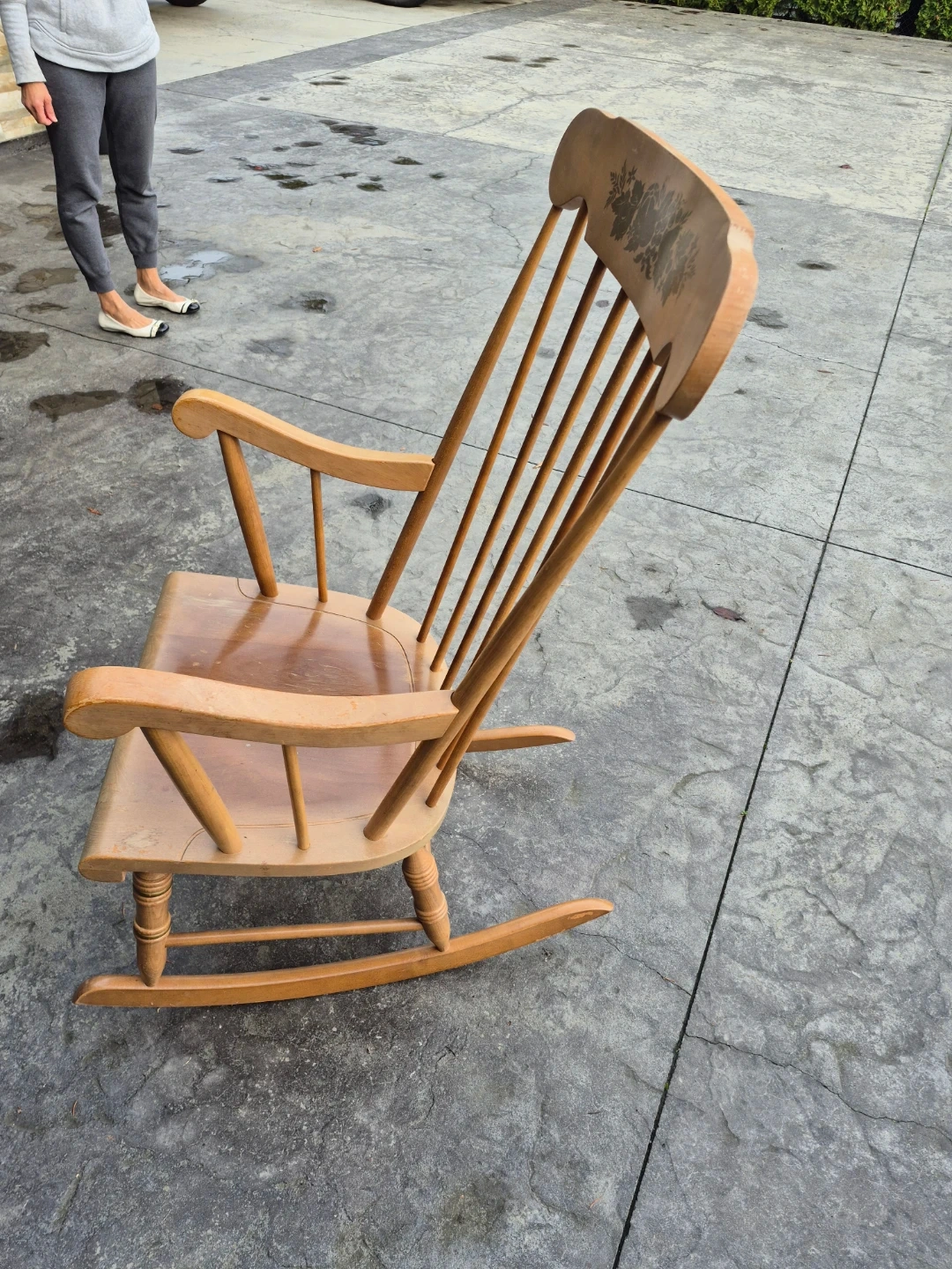 Selling a classic wooden rocking chair. It's in great condition and would be a lovely addition to any home. The chair has a beautiful natural wood finish and a comfortable design. Perfect for relaxing evenings!