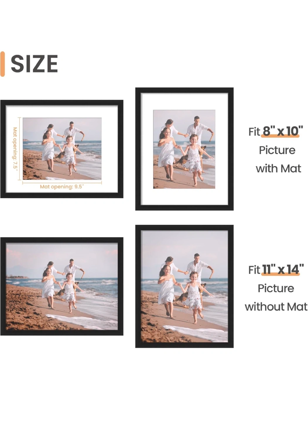 I have a set of picture frames available. They are black and come in two sizes: 8x10 inches (with mat) and 11x14 inches (without mat). Great for displaying your favorite photos! 4 frame for set, able to separate amount!!