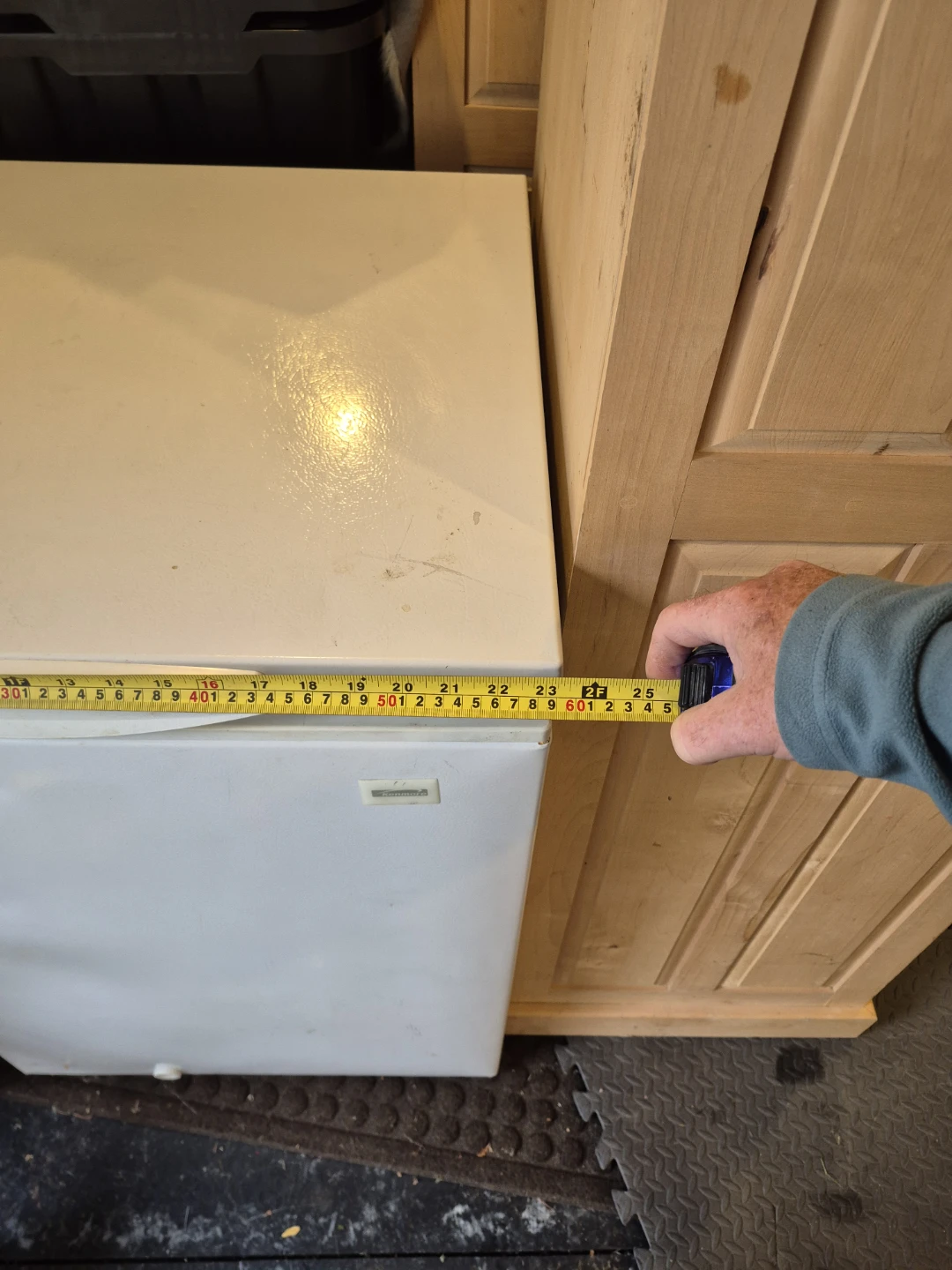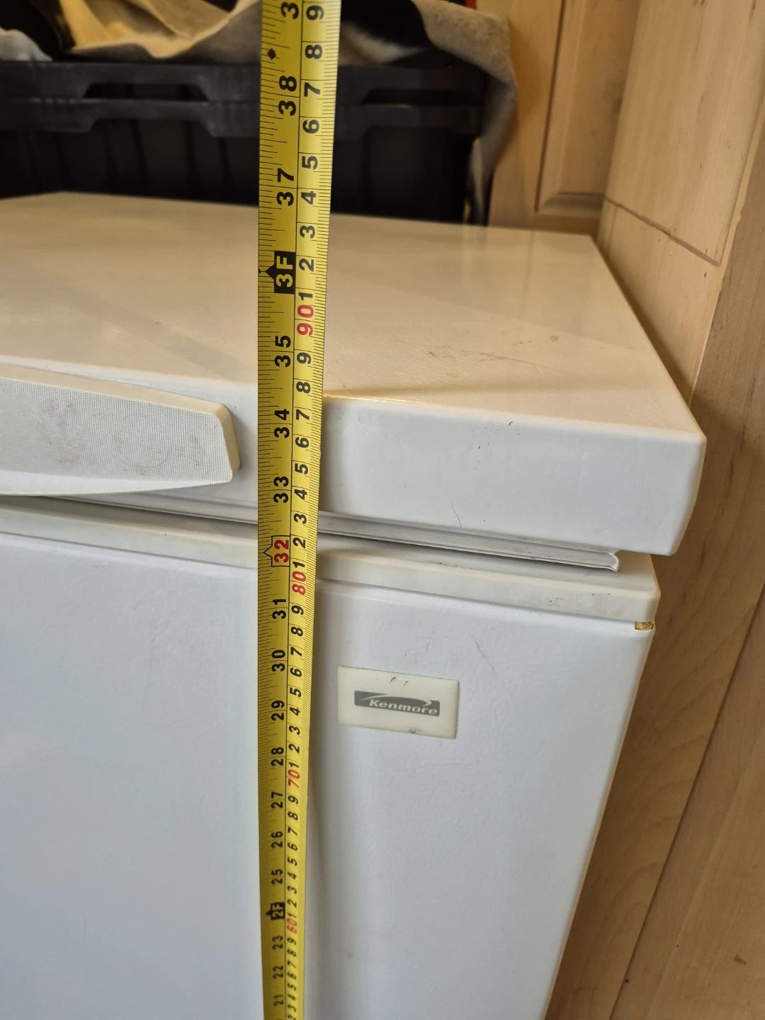 Selling a Kenmore chest freezer. It's white and in good working condition. The approximate dimensions are 32 inches in height, 27 inches in width, and 24 inches in depth. Perfect for extra storage!