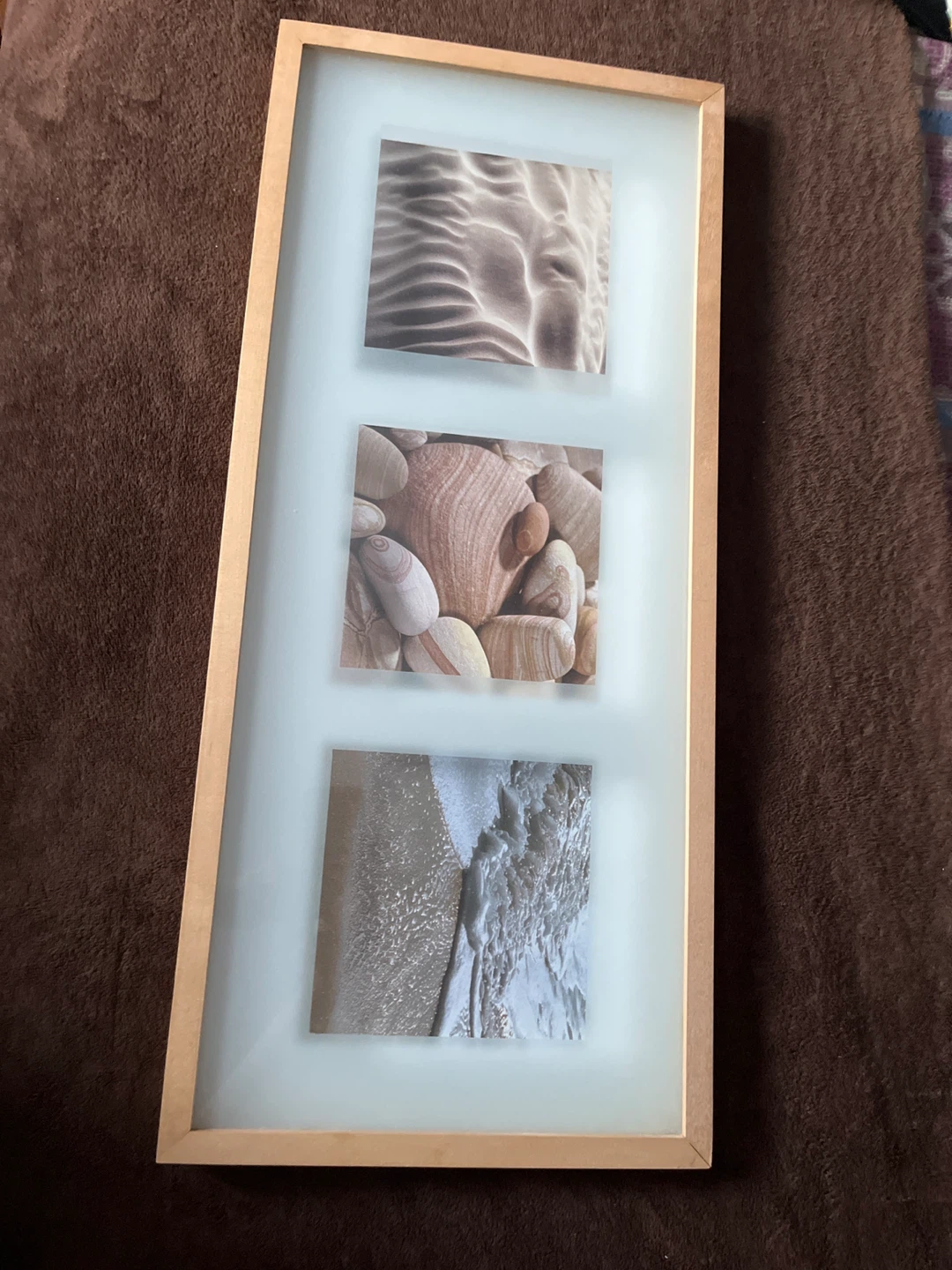 IKEA lovely framed piece of wall art! It features a beach theme with three different images: sand, rocks, and waves. It's in excellent condition and ready to brighten up your space. Cash only please.