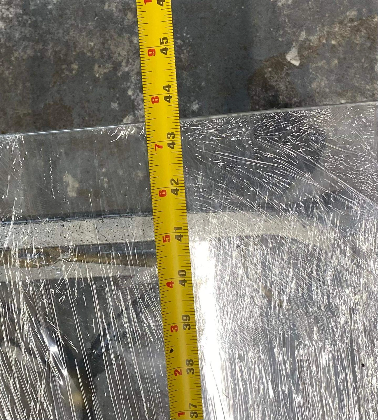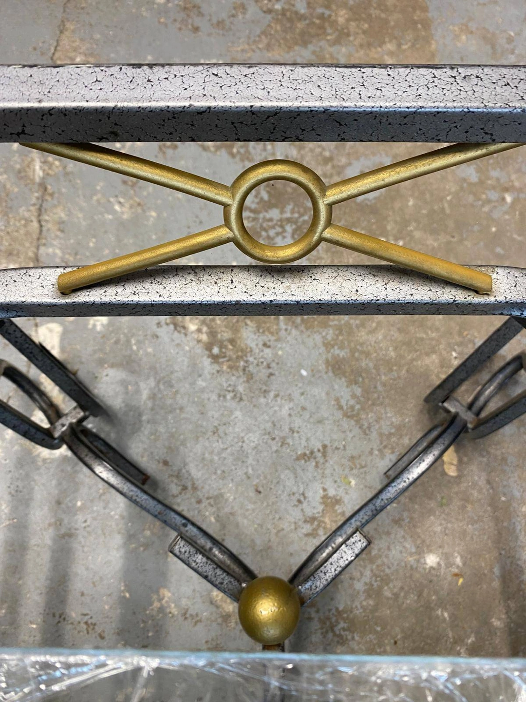 Selling a glass top coffee table with a metal frame. 43.5 "length x 21 " wide x 14 " ht. The table is wrapped in plastic for protection during transport. one ornament side is damaged, see picture