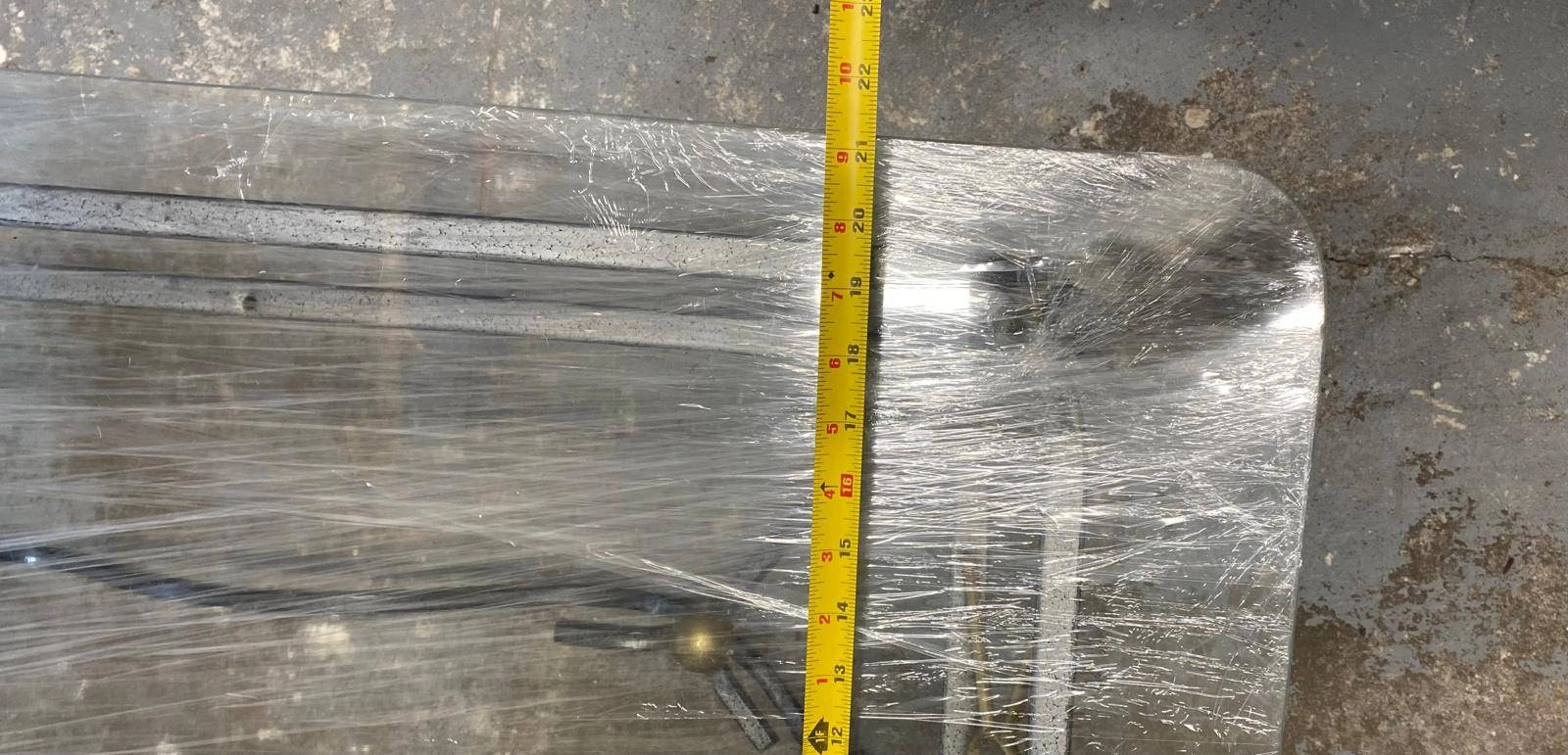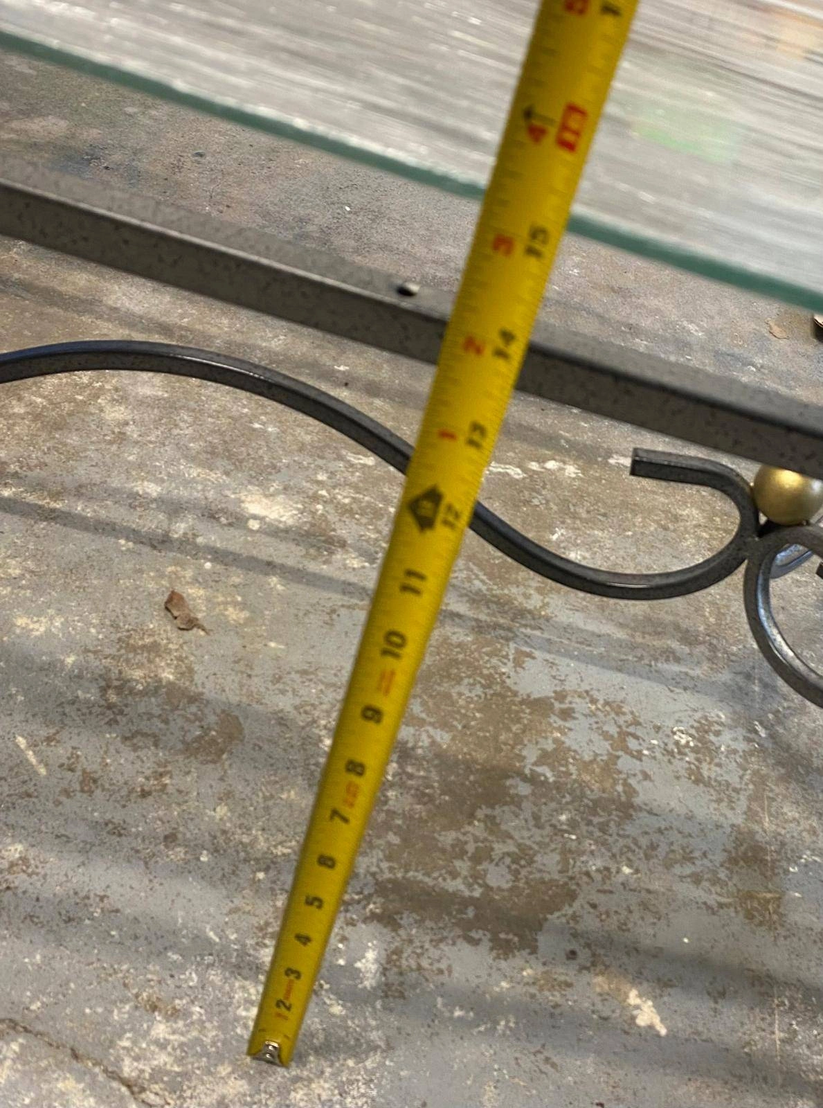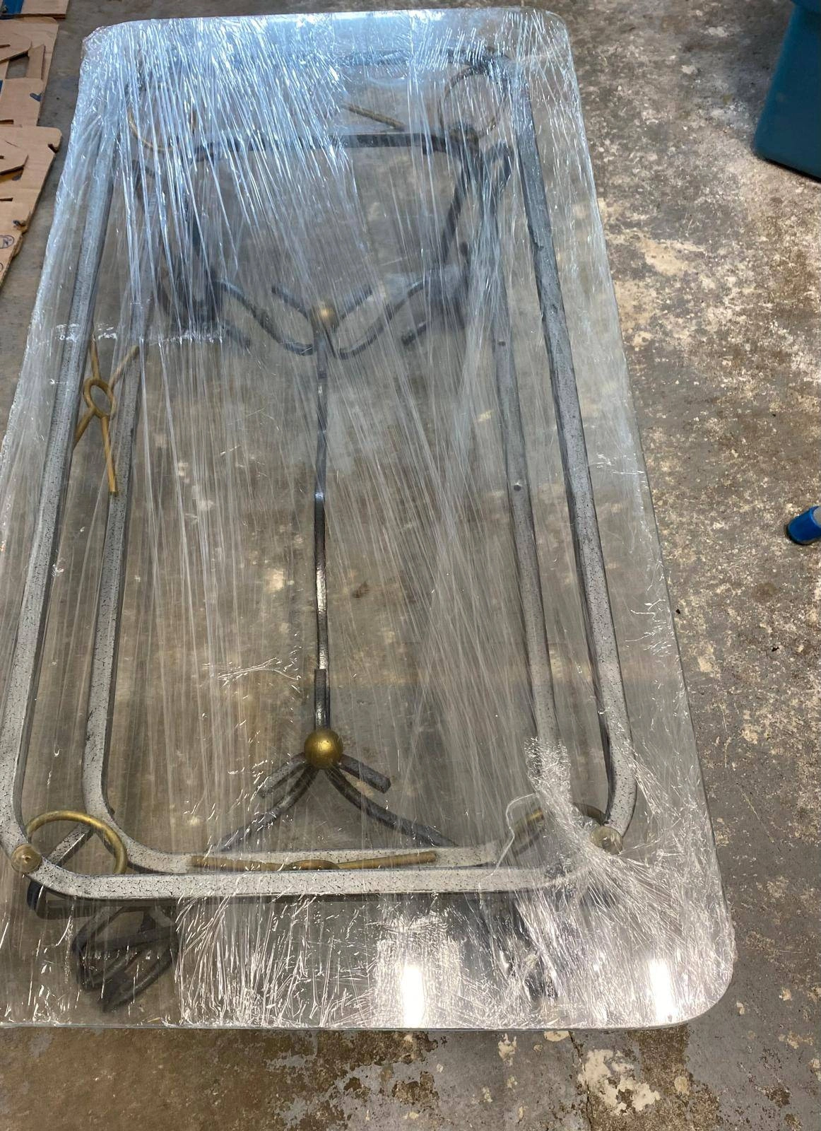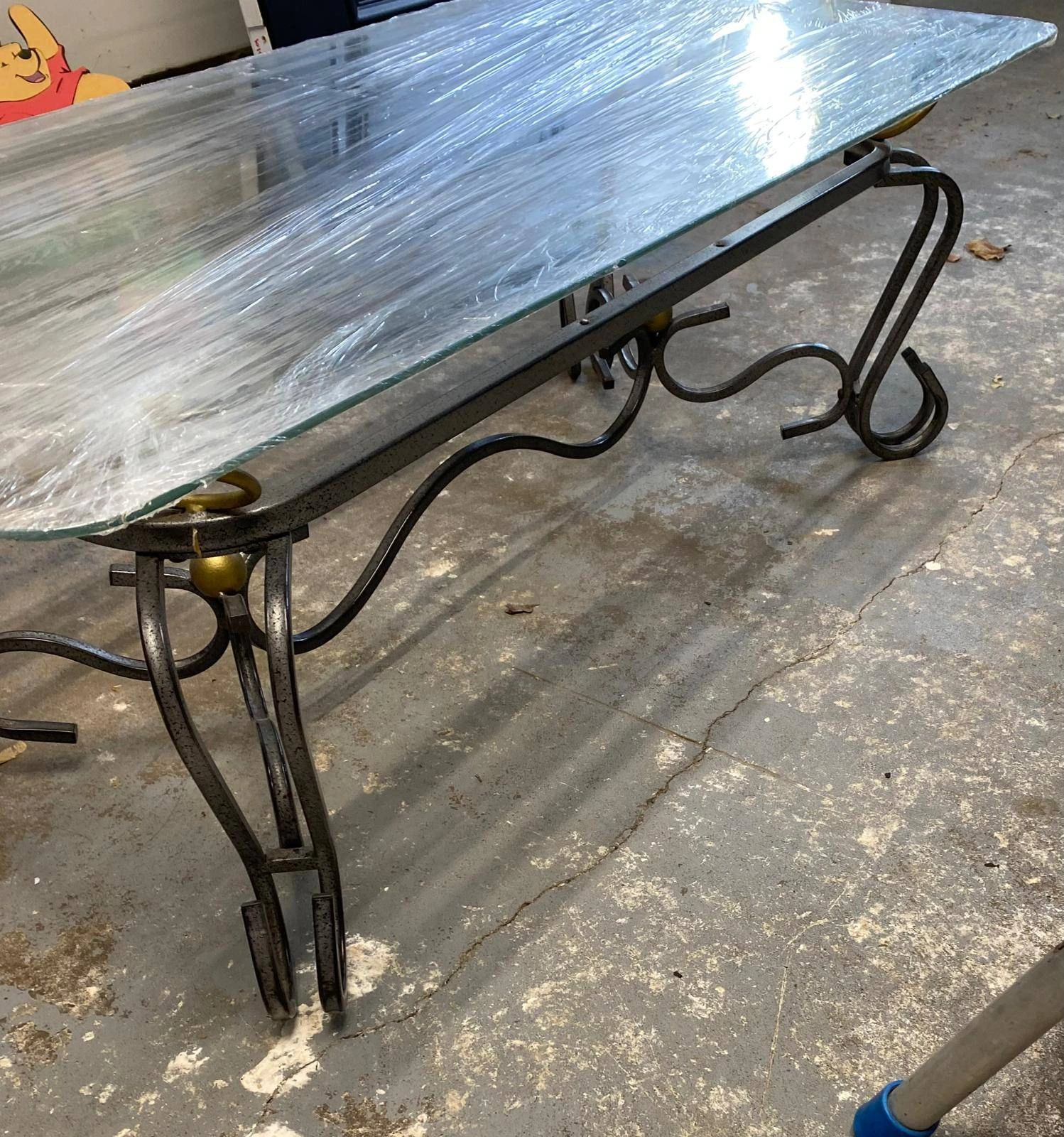 Selling a glass top coffee table with a metal frame. 43.5 "length x 21 " wide x 14 " ht. The table is wrapped in plastic for protection during transport. one ornament side is damaged, see picture
