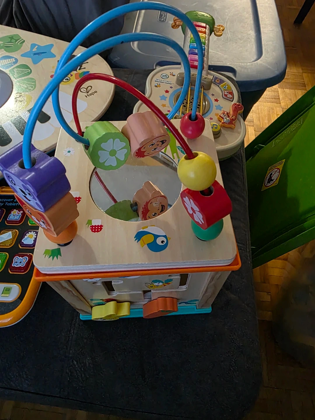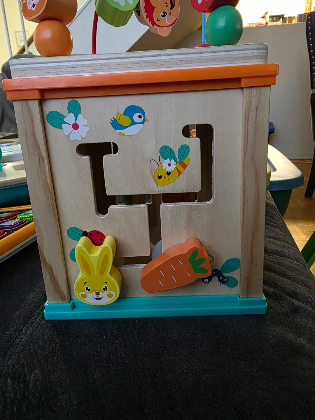 This wooden activity cube is perfect for keeping little ones entertained! It features a variety of activities on each side, including shape sorting, bead mazes, and spinning gears. It's in great condition and ready for a new home!