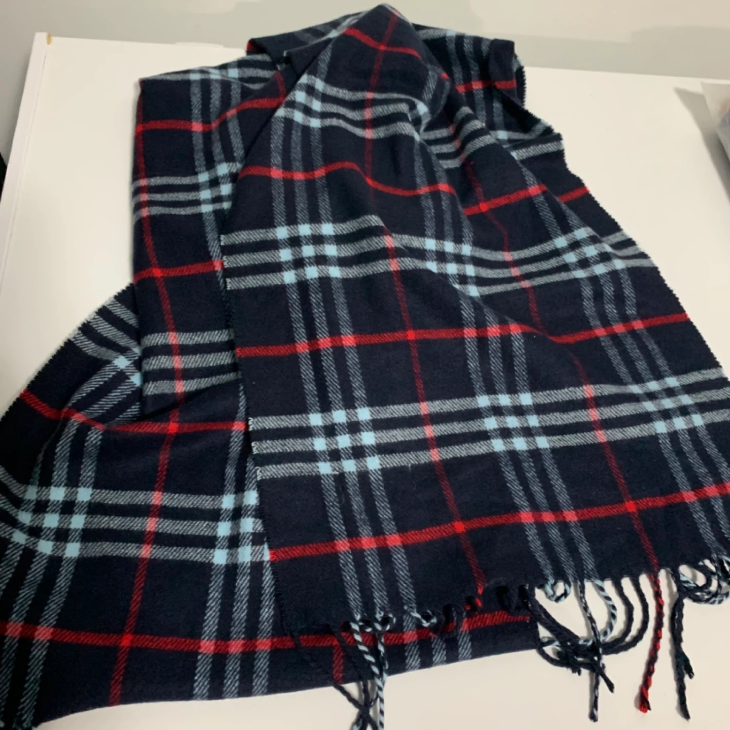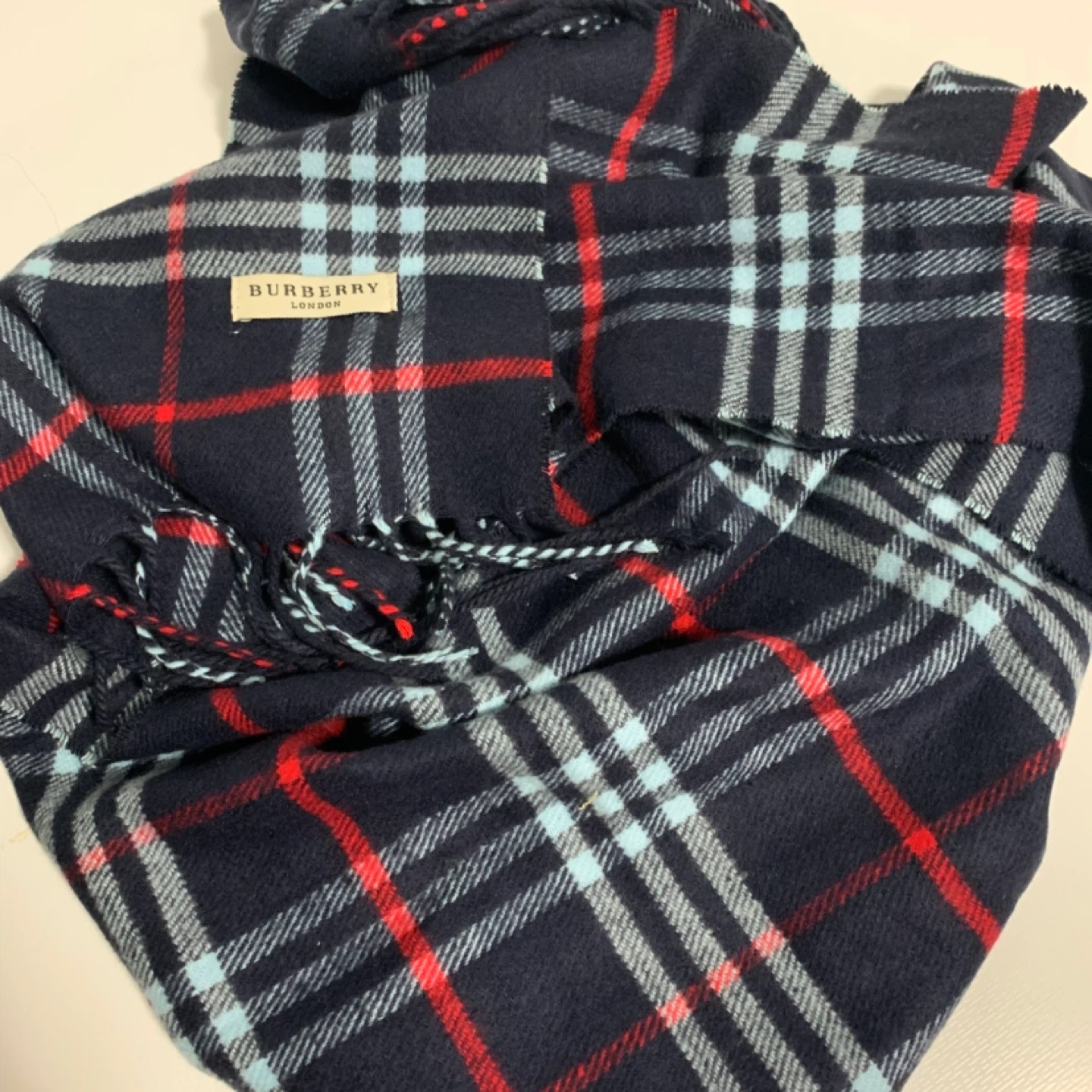 Selling a stylish Burberry London scarf with a classic plaid pattern! The scarf features a beautiful blend of colours, including navy, light blue, red, and grey. It's in great condition and ready to keep you warm this season