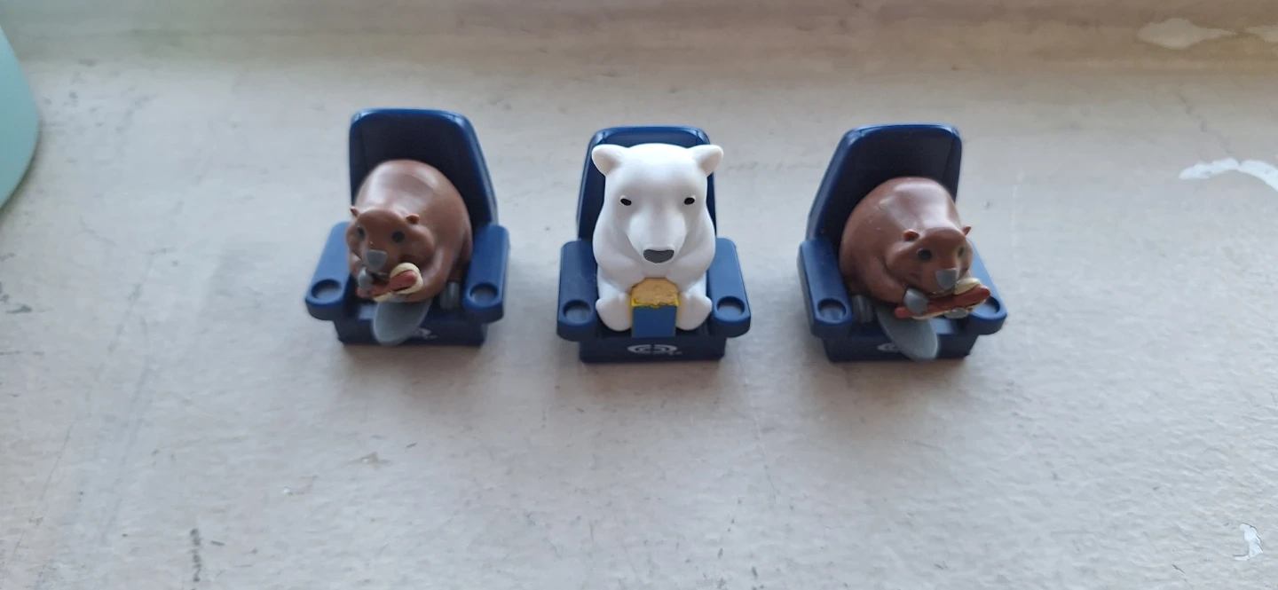 Giving away a set of Canada Goose figurines from Cineplex. There are two beavers and one polar bear, all seated in blue chairs. They are in great condition and would make a cute addition to any collection.