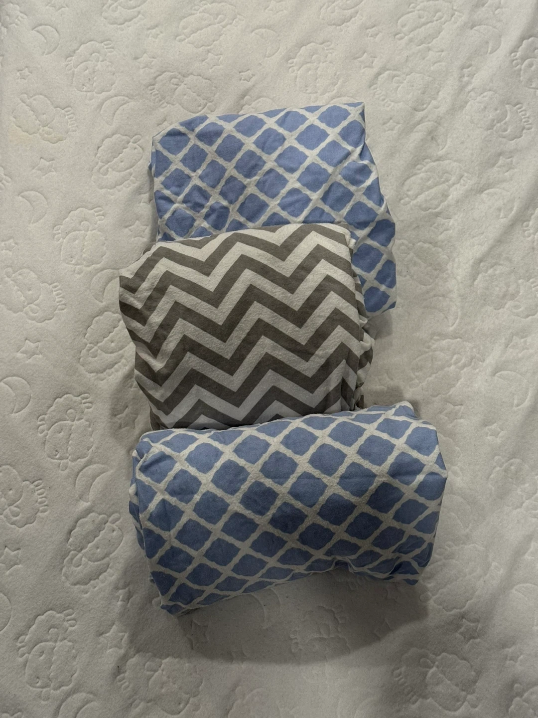 Selling a set of three baby crib fitted sheets! There are two blue sheets with a diamond pattern and one grey sheet with a chevron pattern. They're in great condition and ready for a baby’s crib! Thank you for visiting my listing!