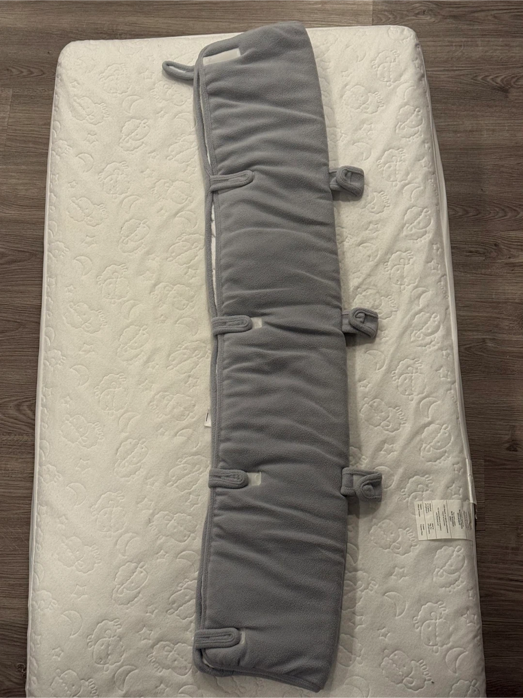 Selling a grey crib rail cover! It's in great condition and ready to protect your little one's gums and your crib from teeth marks. It's a soft, padded cover that easily attaches to the crib rails. Thank you for visiting my listing!