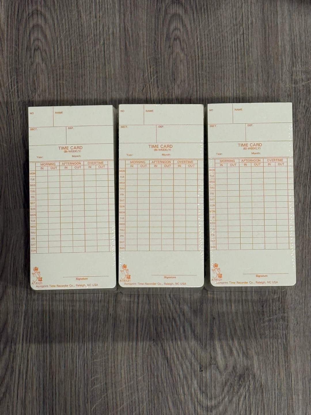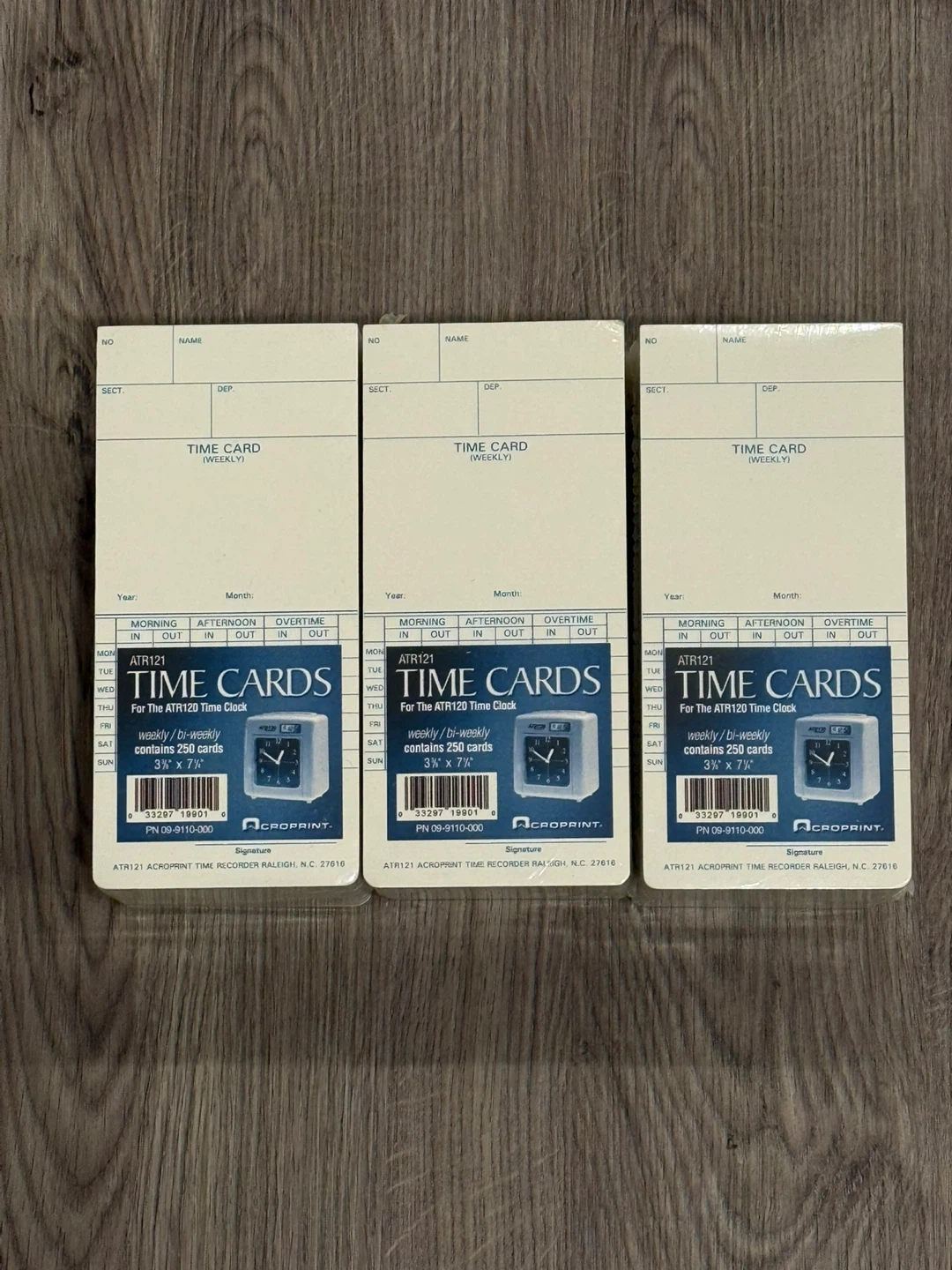 I'm selling three packs of Acroprint ATR121 time cards. Each pack contains 250 cards. These are for the ATR120 Time Clock and are weekly/bi-weekly cards. They measure 3 3/8" x 7 3/8". Thank you for visiting my listing!