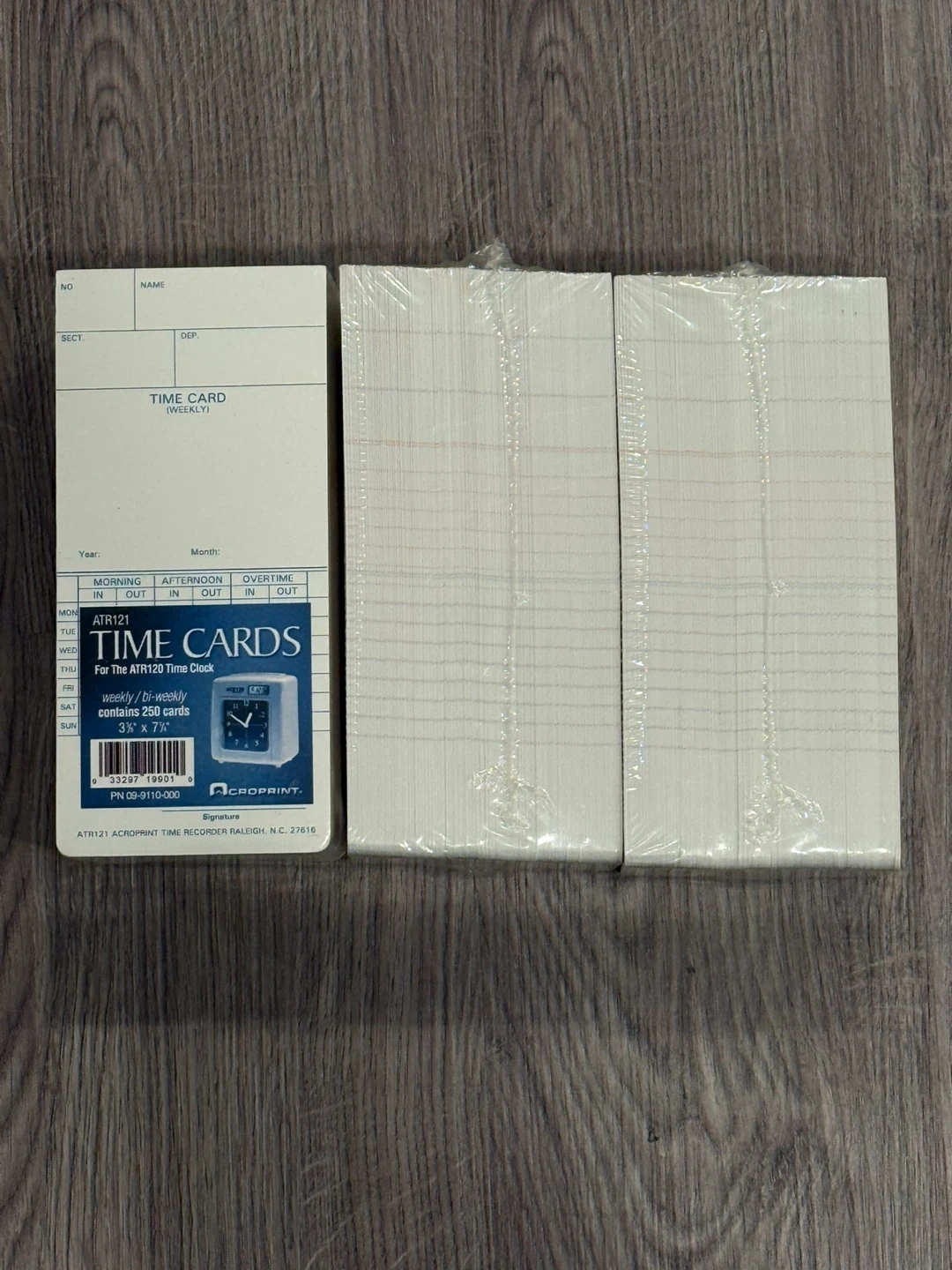I'm selling three packs of Acroprint ATR121 time cards. Each pack contains 250 cards. These are for the ATR120 Time Clock and are weekly/bi-weekly cards. They measure 3 3/8" x 7 3/8". Thank you for visiting my listing!
