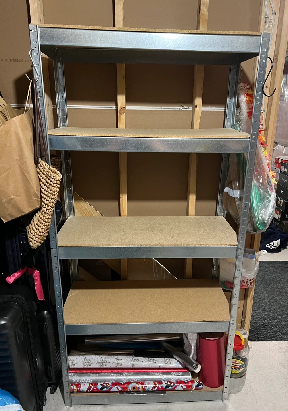 Here's a sturdy metal shelving unit with 4 shelves. Great for organizing your garage, basement, or storage room! It's in good condition and ready to help you get organized