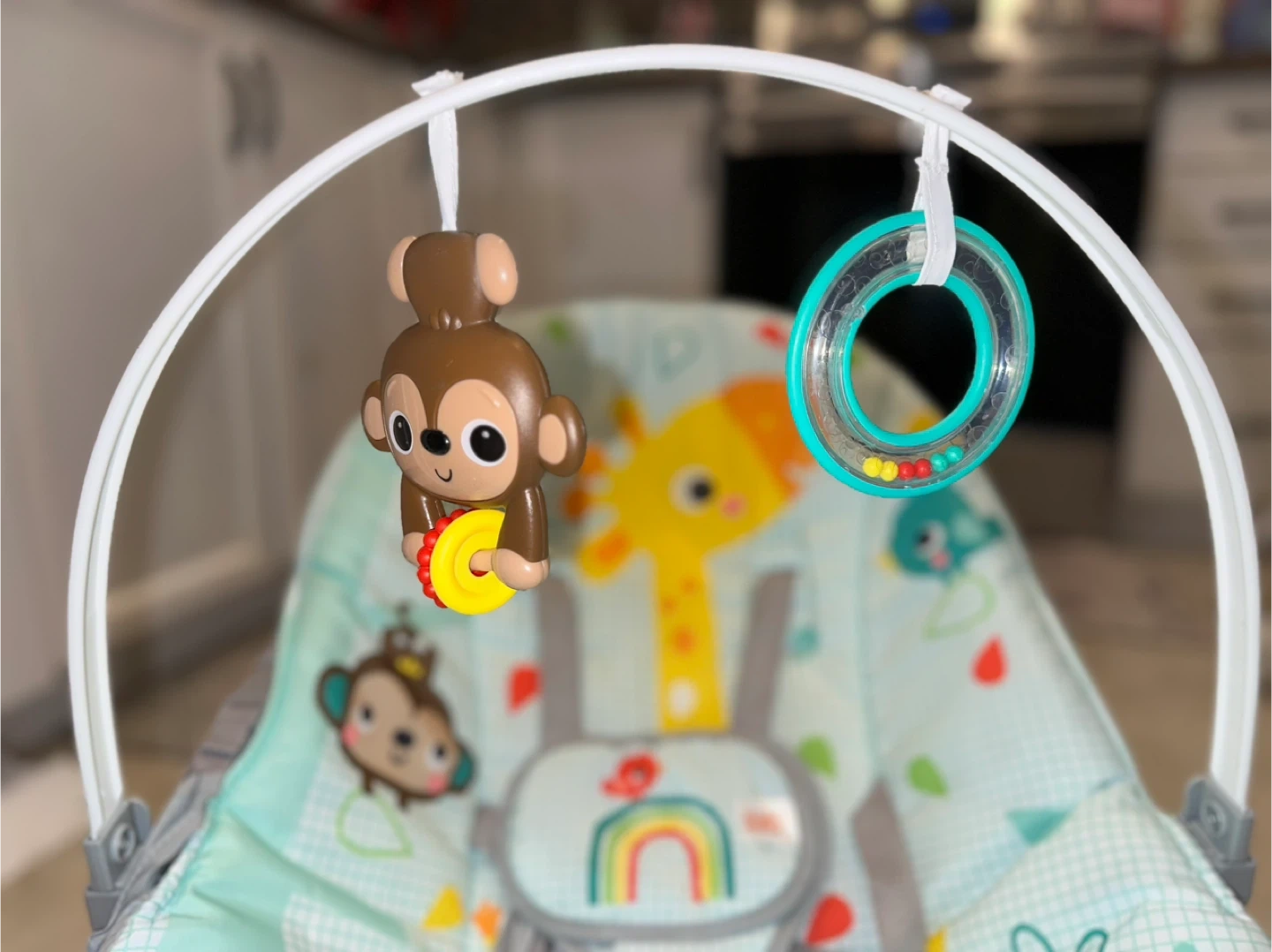 Selling a Bright Starts bouncer in excellent condition! It features a cute giraffe and monkey design, and also has hanging toys for baby to play with. Recommended for infants.