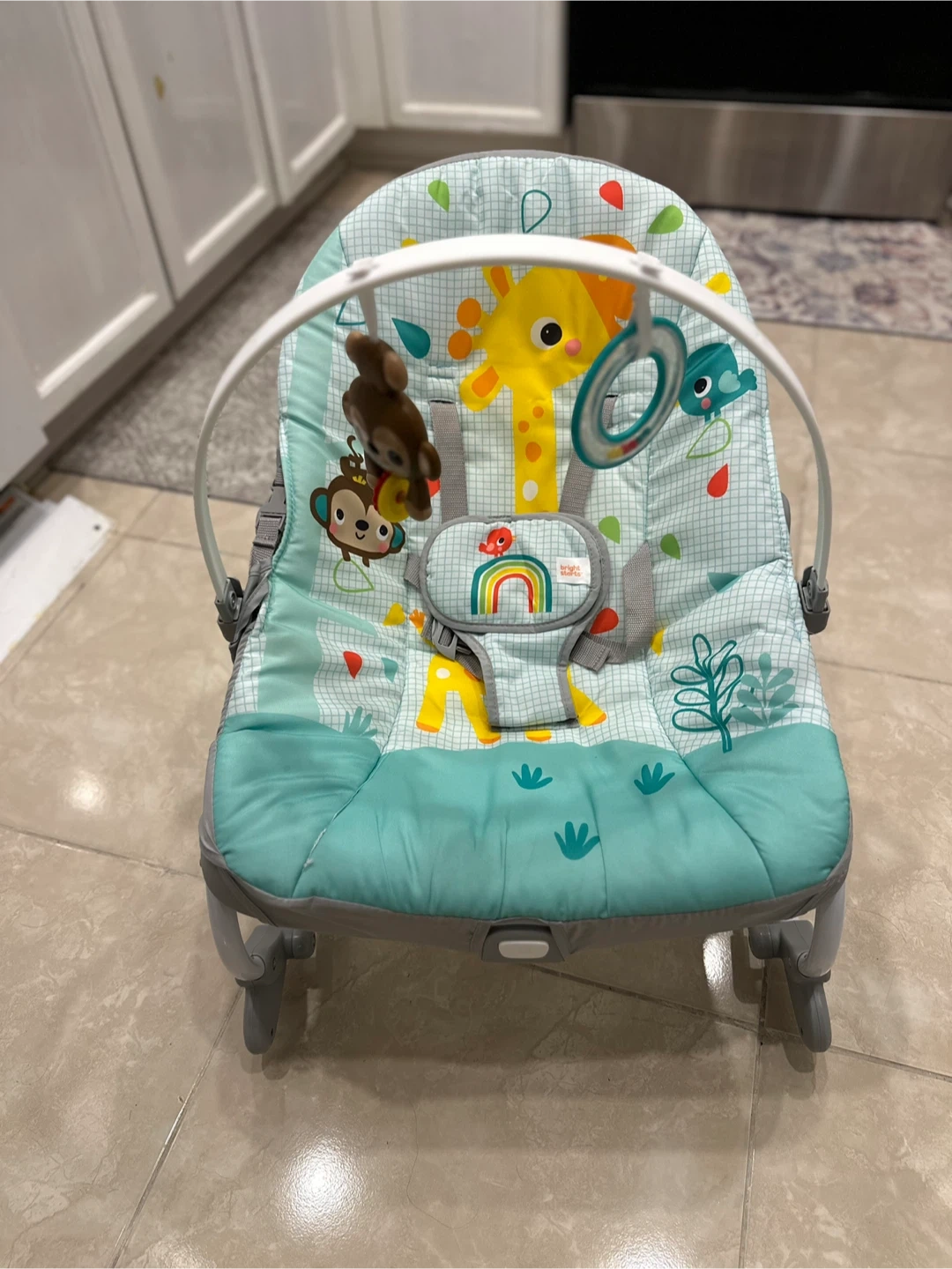 Selling a Bright Starts bouncer in excellent condition! It features a cute giraffe and monkey design, and also has hanging toys for baby to play with. Recommended for infants.
