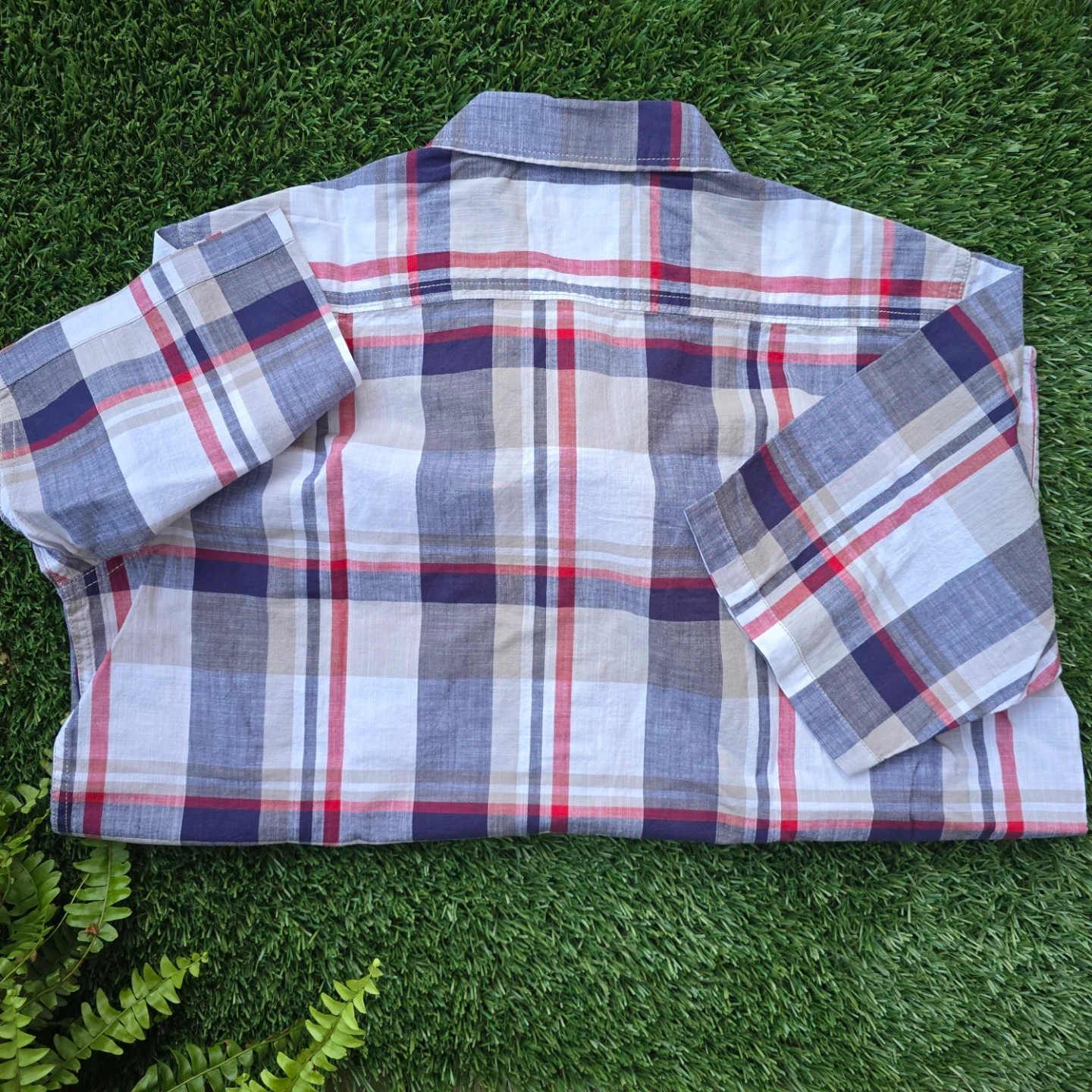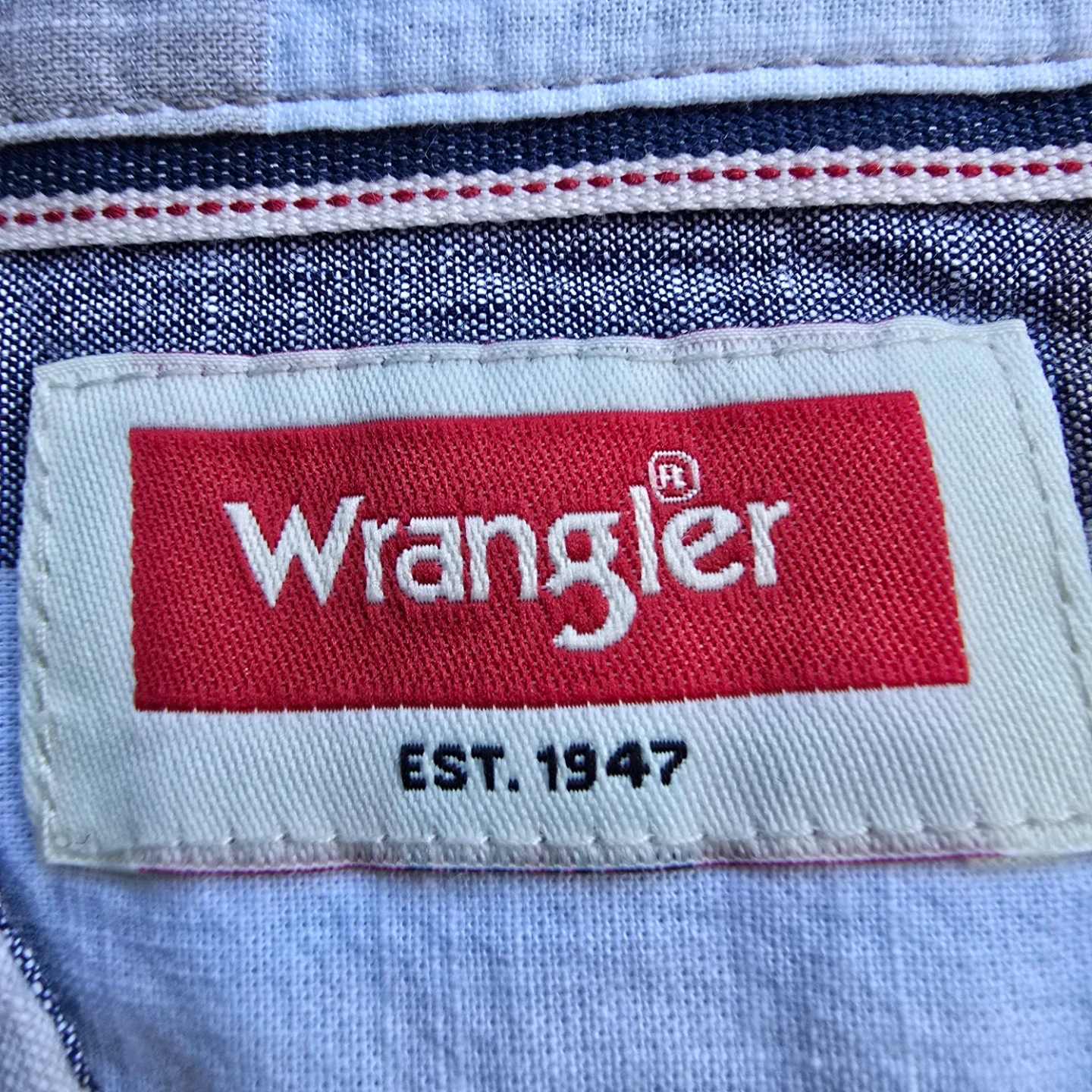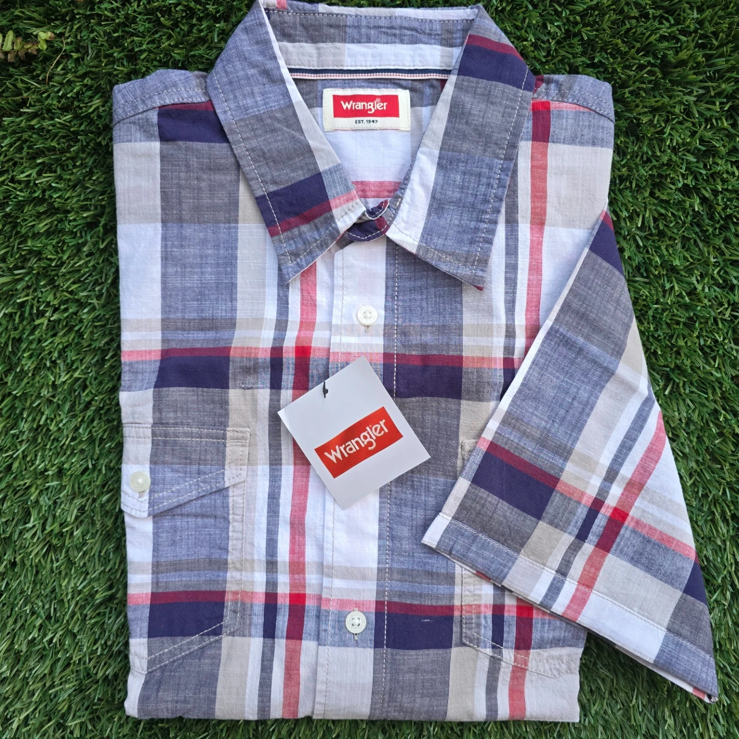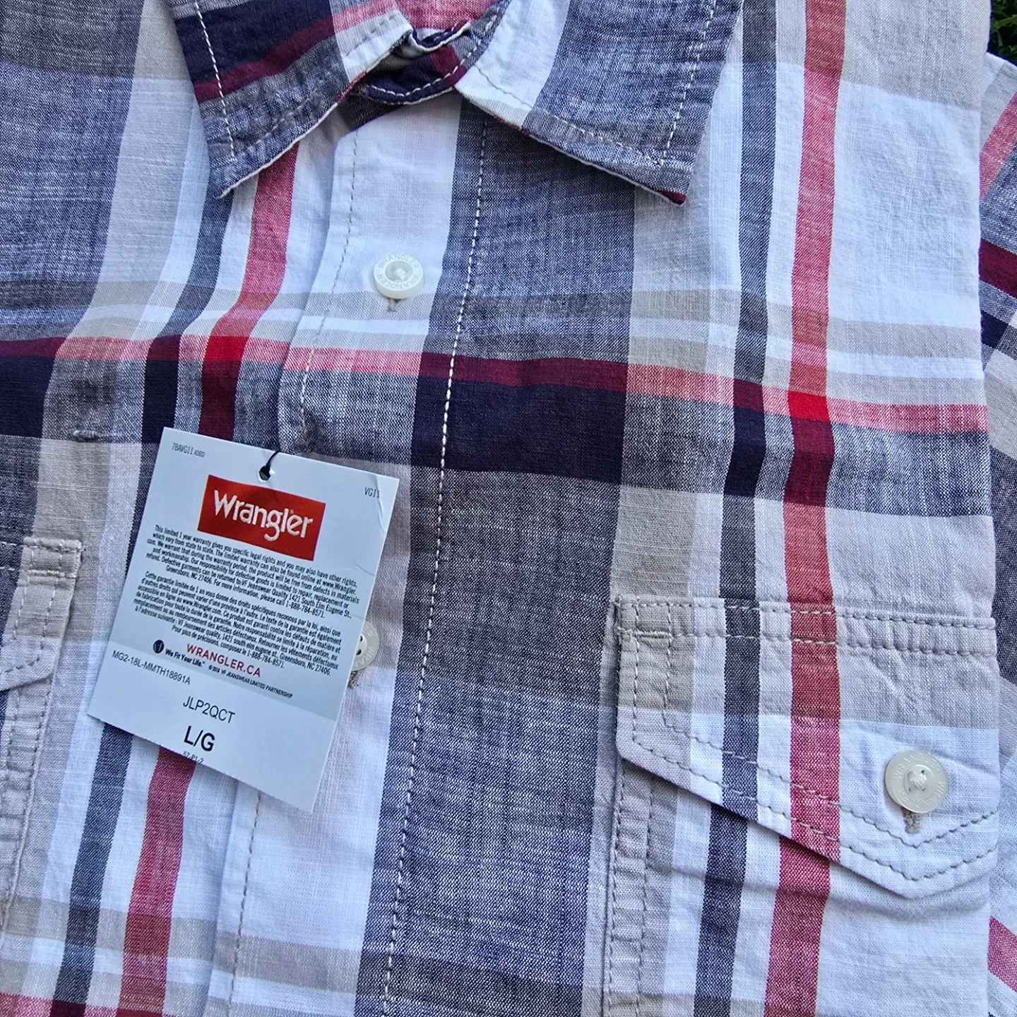 NEW with Tags! Wrangler Men's Cowboy Plaid Shirt. Featuring a classic red, blue, and white plaid pattern, short sleeve. This shirt offers both comfort and style. Perfect with denim jeans and boots or shorts. It features a classic plaid pattern in a mix of colours. Size Large.
