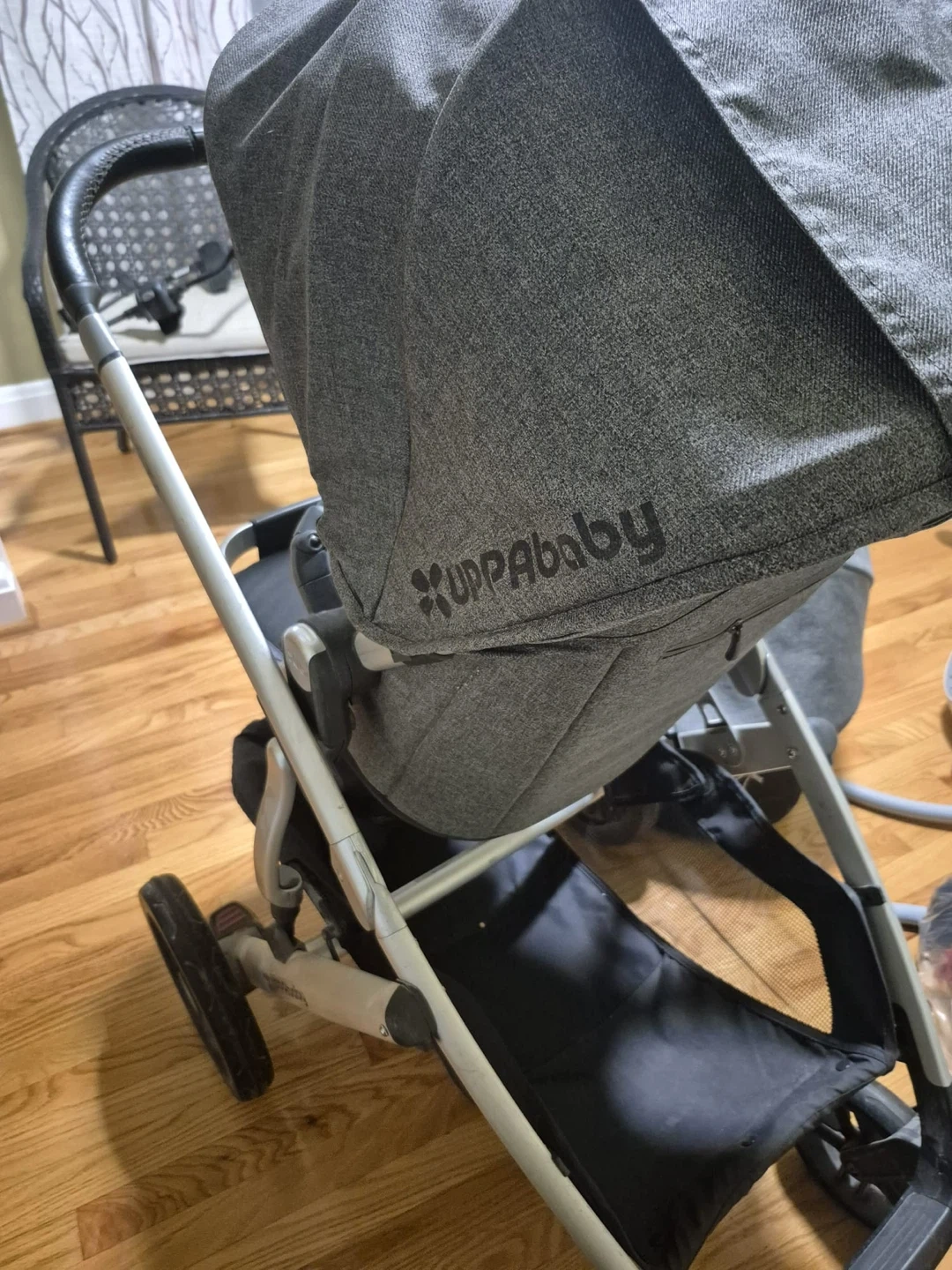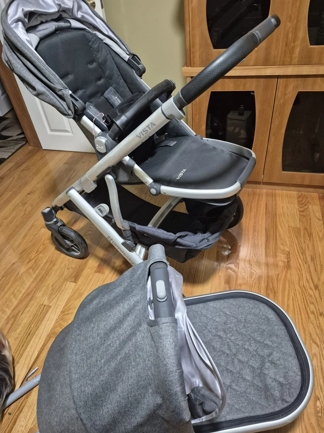 Selling an UPPAbaby VISTA stroller in great condition! It comes with the bassinet attachment, perfect for newborns. The stroller is grey and made of 100% polyester. Manufactured in Feb 2019.