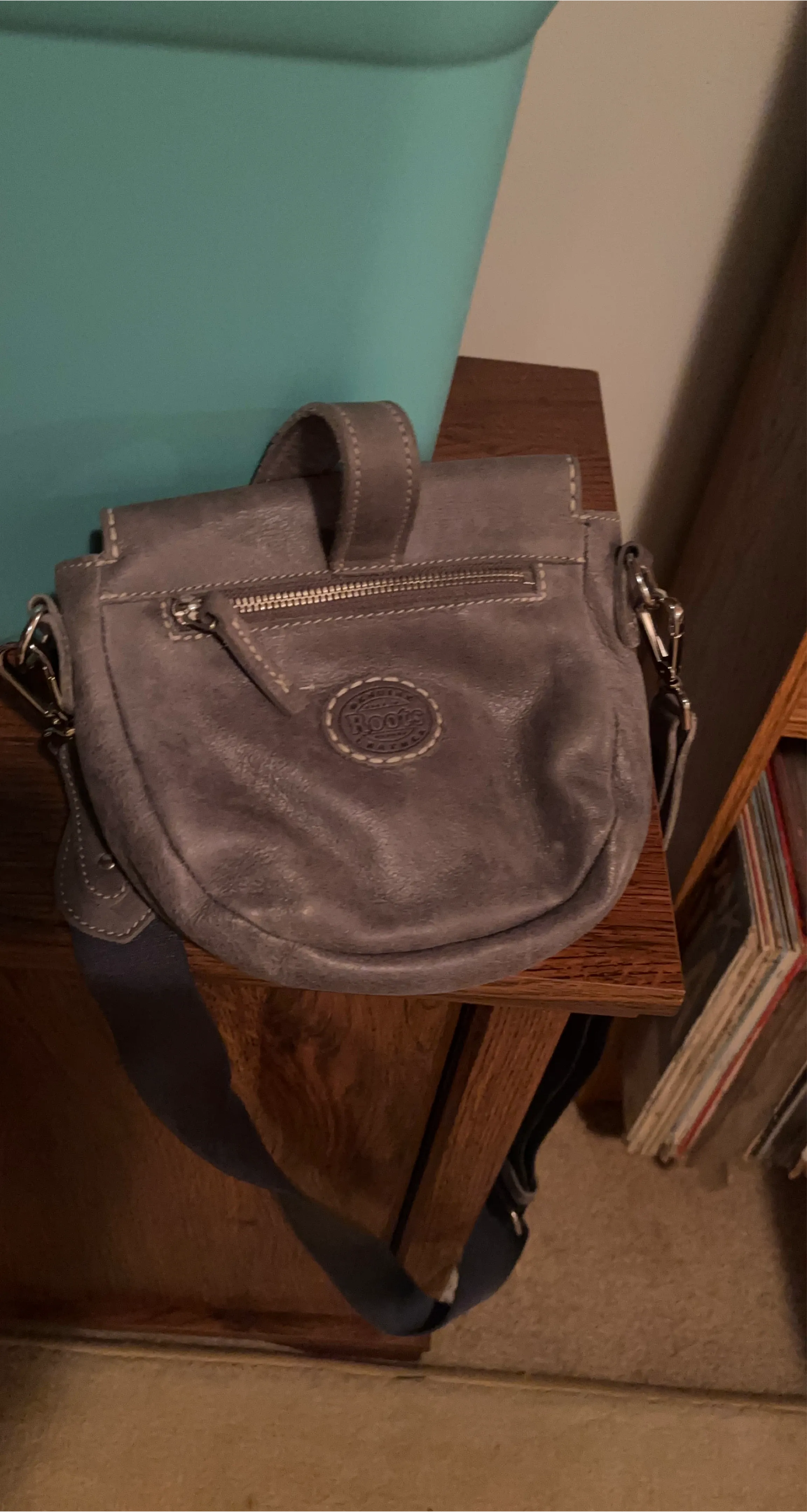 Selling a Roots crossbody bag in a lovely grey colour. It's made of leather and has a zipper on the back. Great for everyday use!