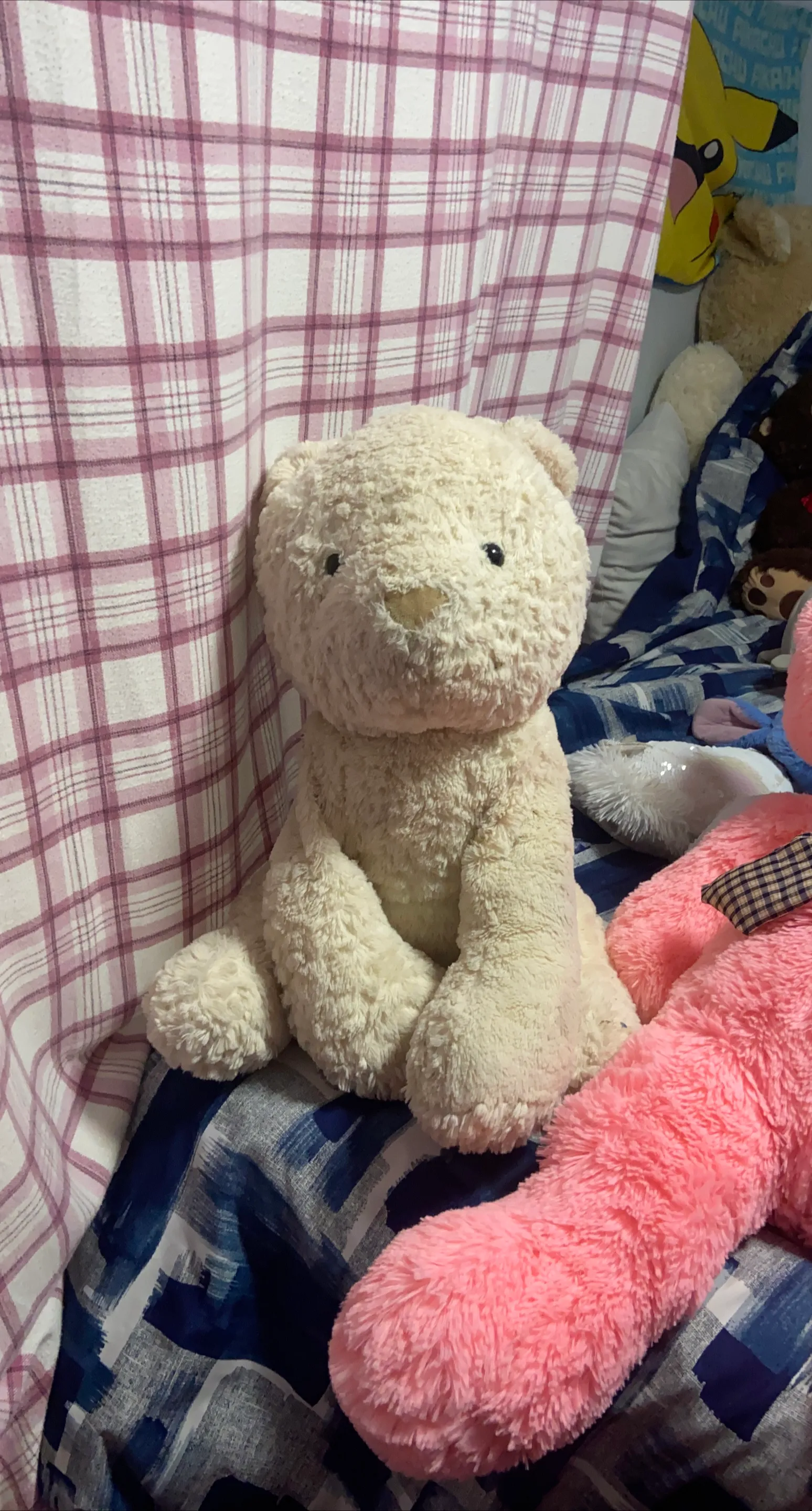 A cuddly cream-coloured plush teddy bear, perfect for snuggling up with! It's in great condition and ready for a new home. A lovely addition to any collection of plushies jumbo bunny has a couple of stains but other than that pretty good condition