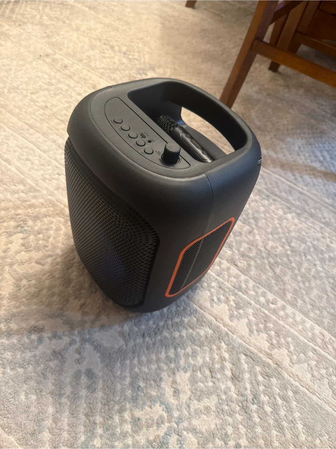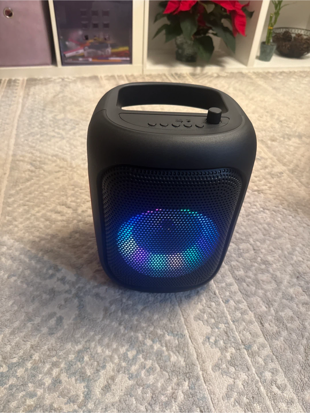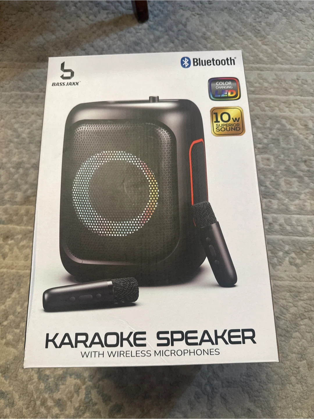 Selling a Bass Junk portable Bluetooth speaker! It's black with orange accents and has cool RGB lights that change color. It comes with the original box. Great for parties or just listening to music around the house