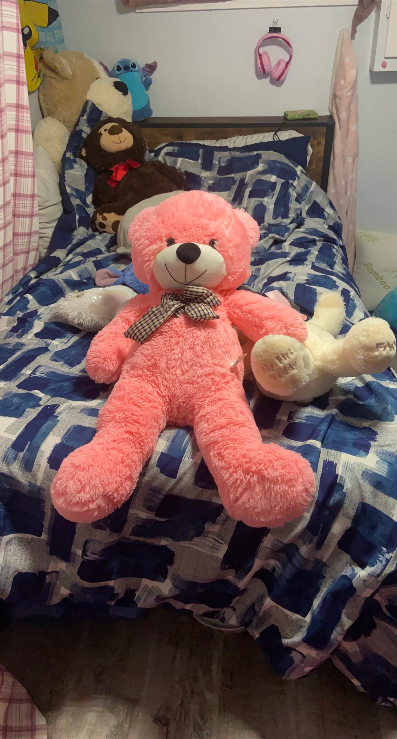 A cute pink teddy bear with a checkered bow tie is looking for a new home! It's in great condition and ready to be cuddled. The stuff is in the background do not come with it.