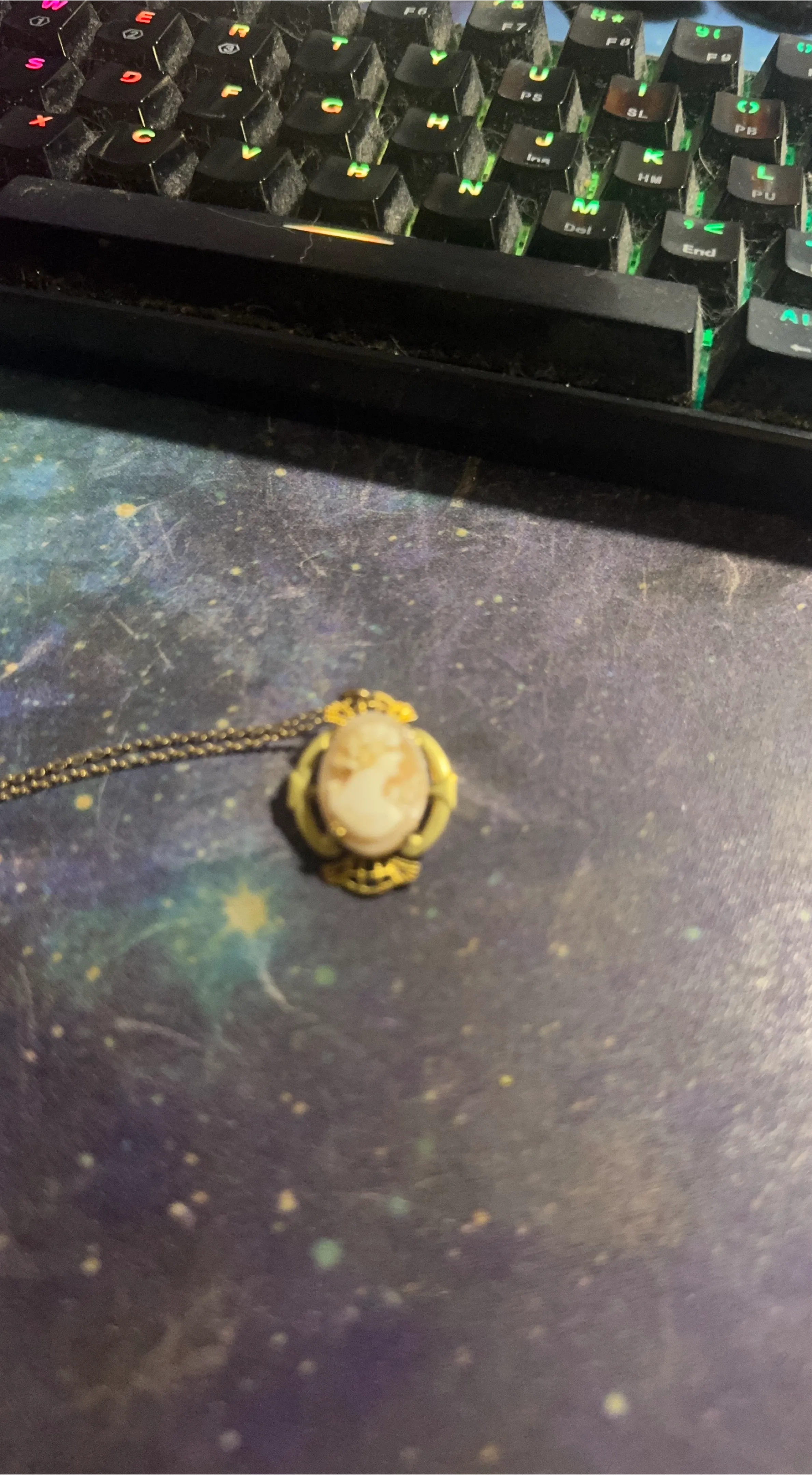 Selling a vintage cameo pendant necklace. It features a delicate cameo set in an ornate gold-tone frame, complete with a matching chain. A lovely piece to add to your jewelry collection!