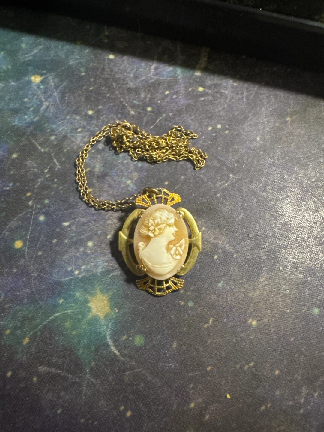 Selling a vintage cameo pendant necklace. It features a delicate cameo set in an ornate gold-tone frame, complete with a matching chain. A lovely piece to add to your jewelry collection!