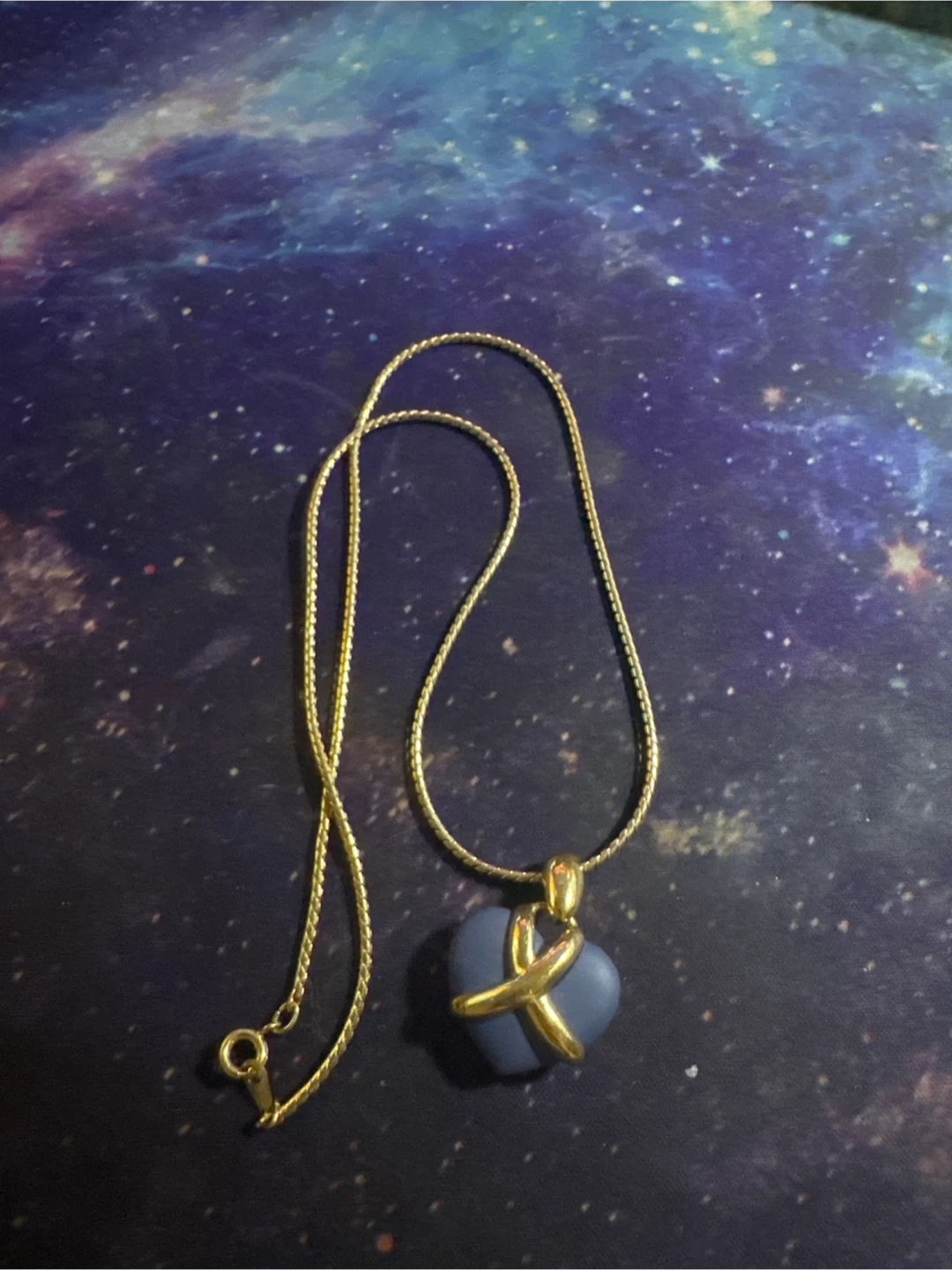 Here's a lovely Wedgwood heart pendant necklace! The heart is a beautiful blue colour, and the chain is gold. It's a very elegant piece and would make a great addition to any jewellery collection
