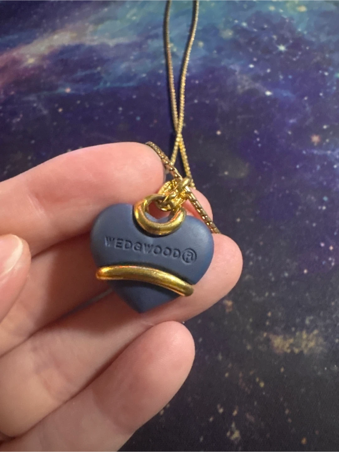 Here's a lovely Wedgwood heart pendant necklace! The heart is a beautiful blue colour, and the chain is gold. It's a very elegant piece and would make a great addition to any jewellery collection