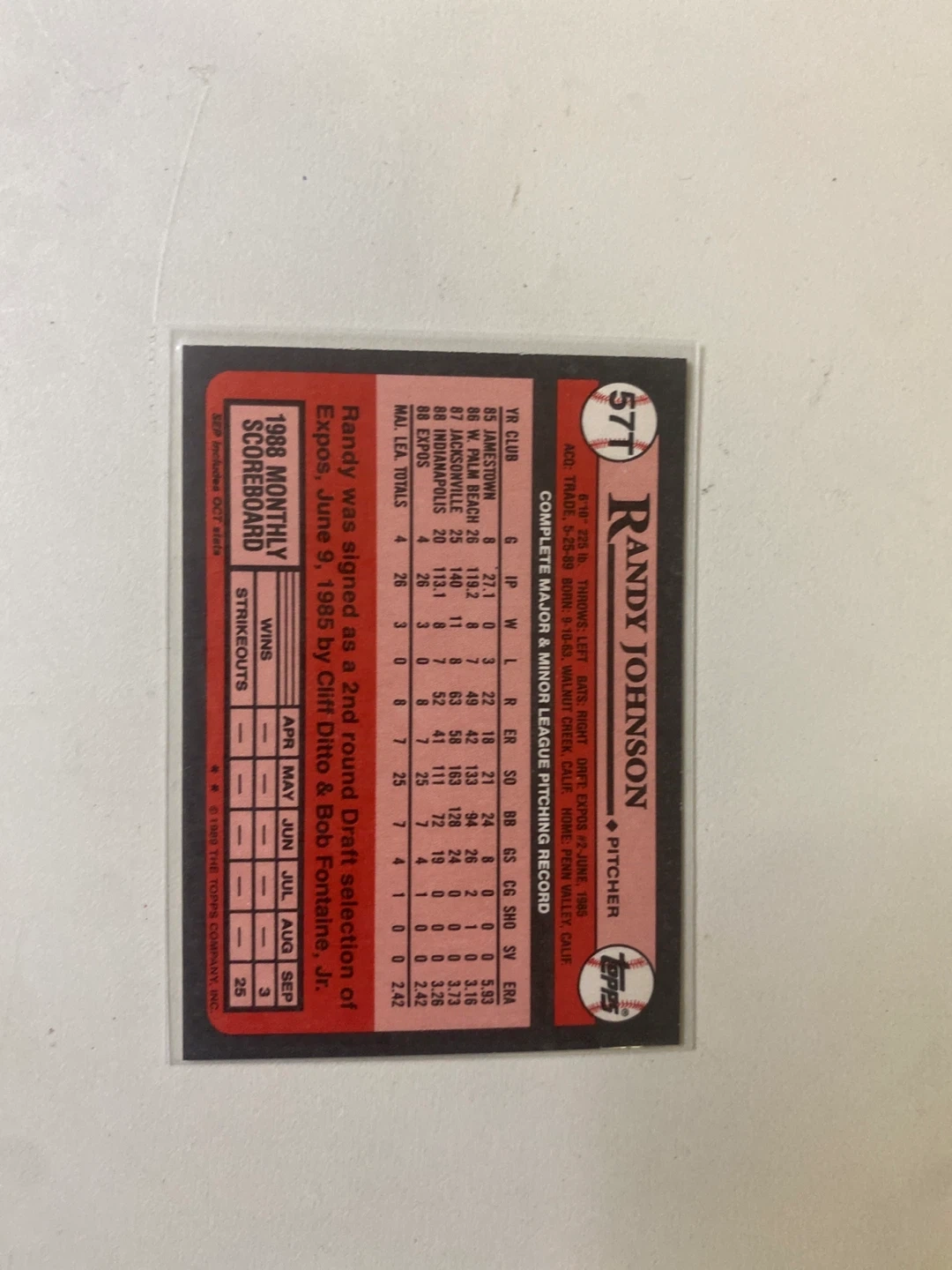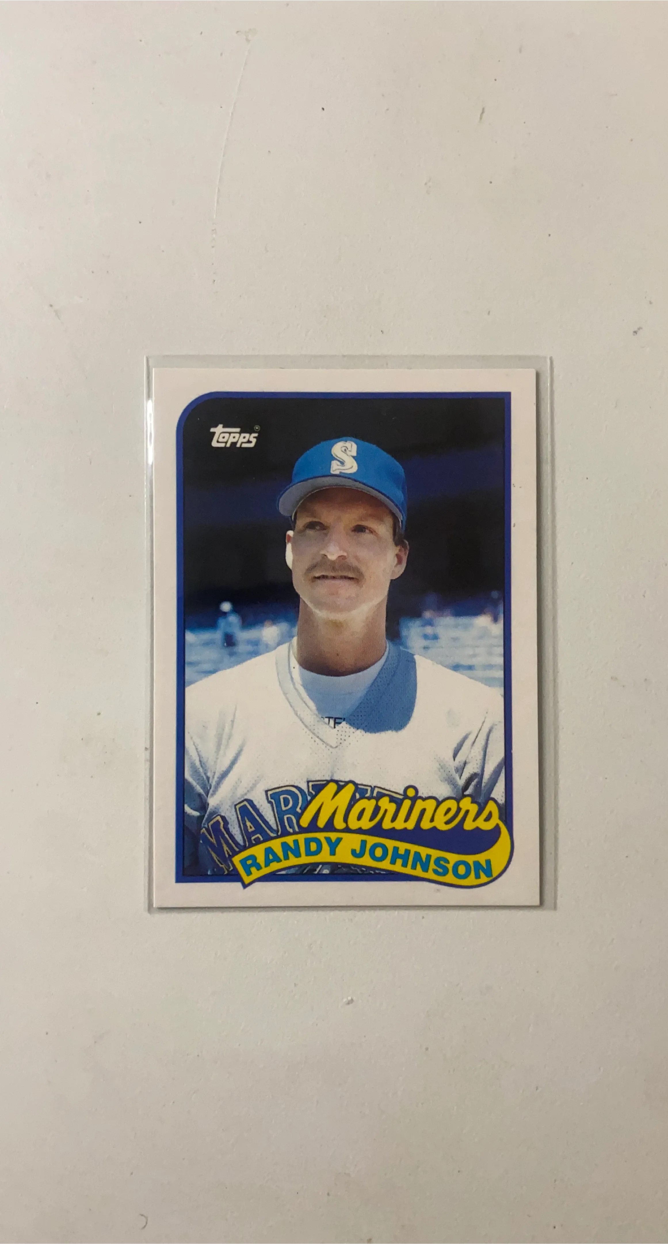 Selling a Topps Randy Johnson baseball card. It features Randy Johnson in his Seattle Mariners uniform. A great addition to any baseball card collection!