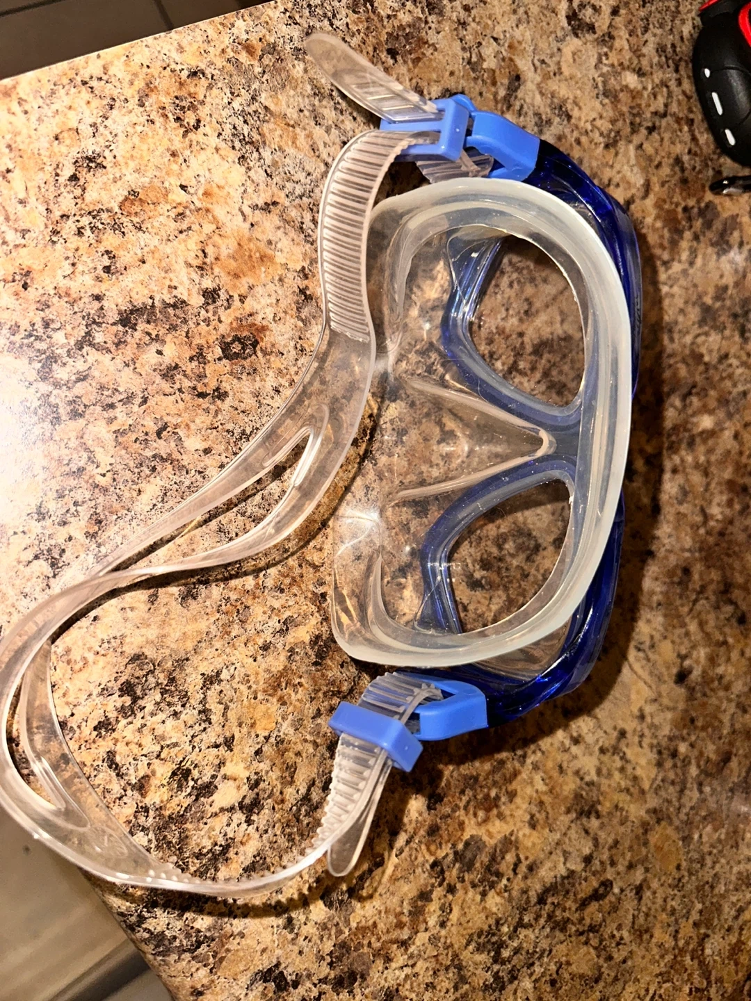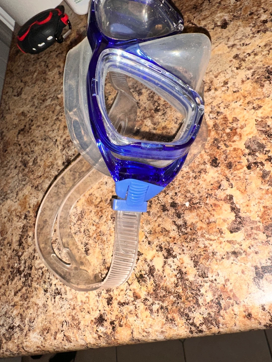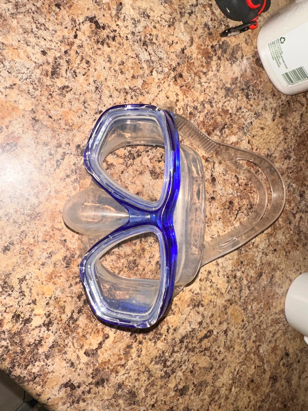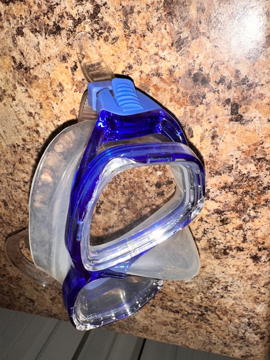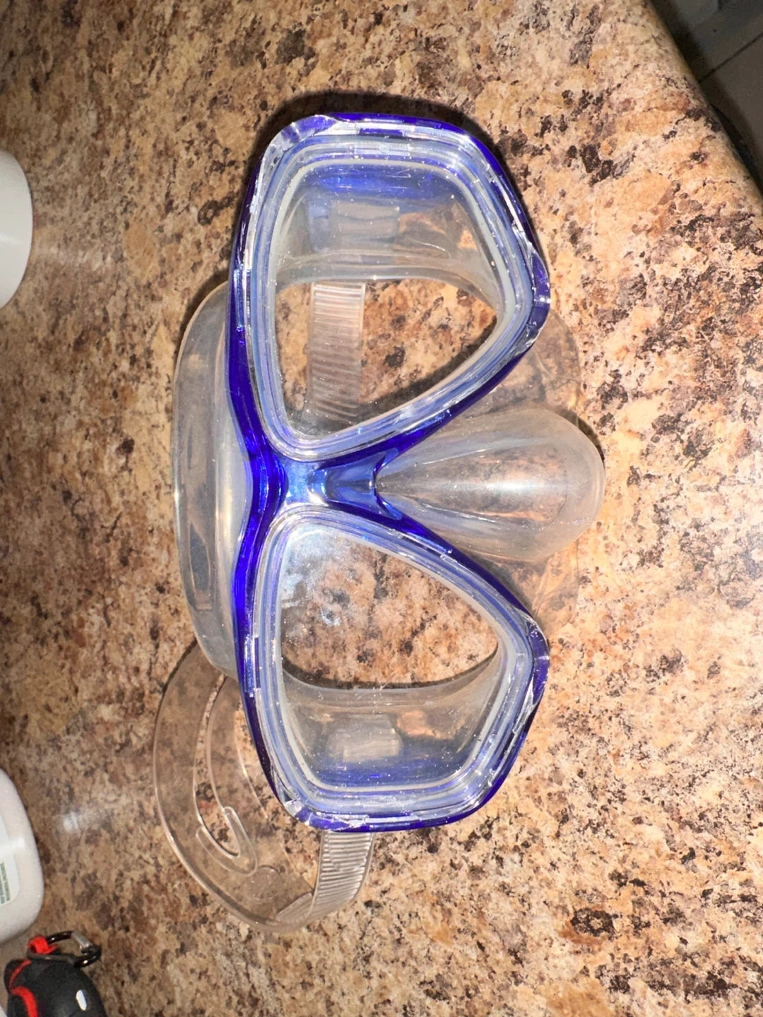 Selling a blue diving mask. It's in good condition and ready for your next underwater adventure! It has a clear lens and adjustable strap for a comfortable fit