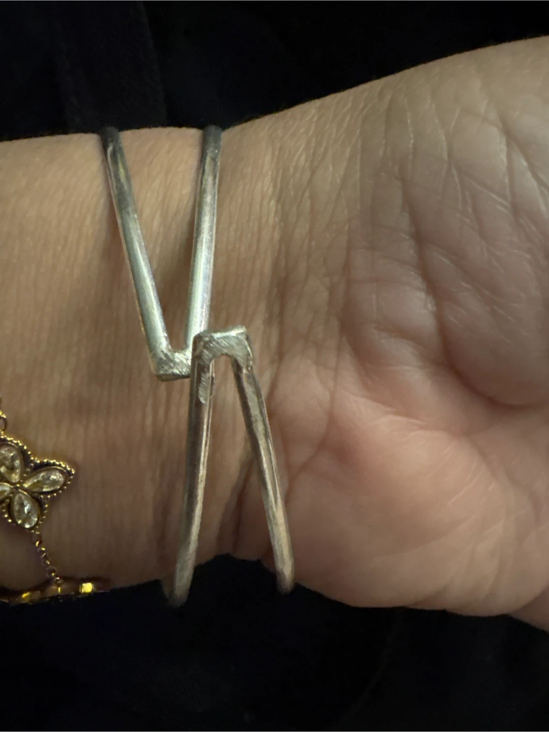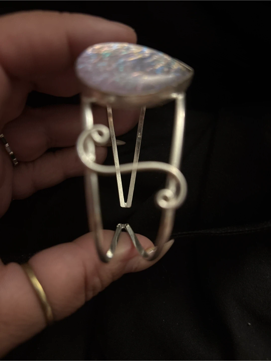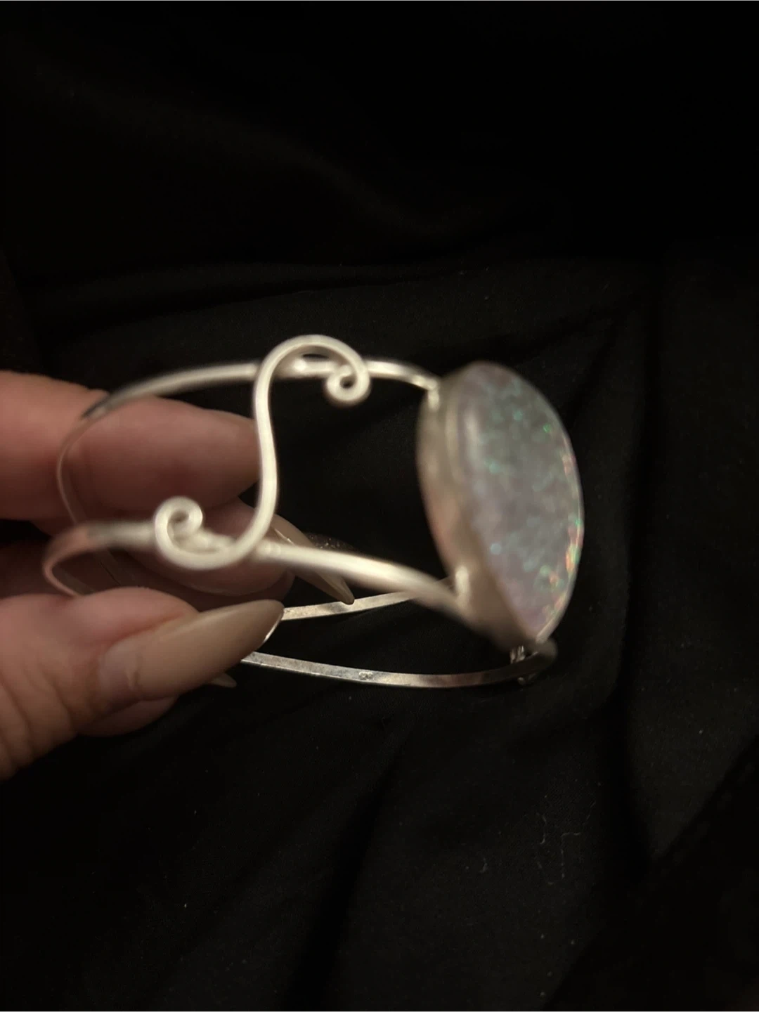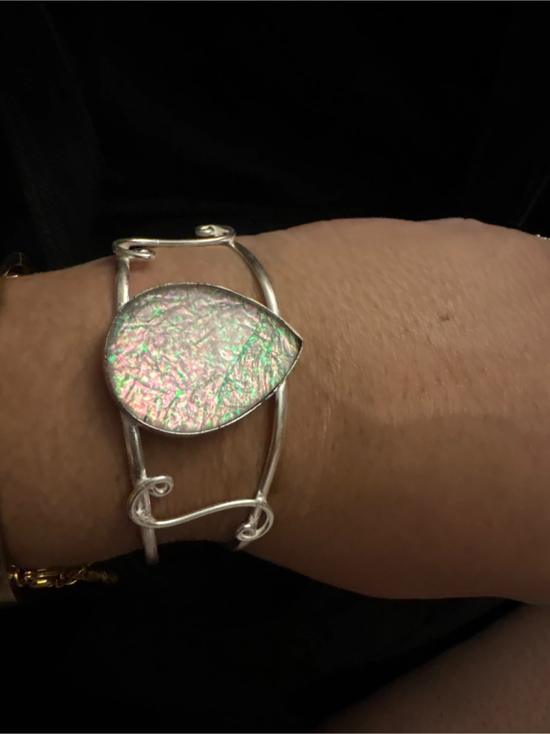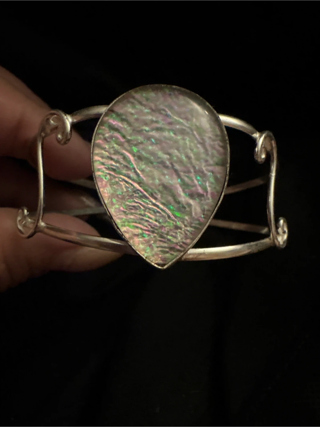 925 Sterling Silver cuff bracelet featuring a tear-drop shaped stone with iridescent colors. The bracelet has an open back and a unique, artistic design. Great to add a touch of elegance to any outfit! New