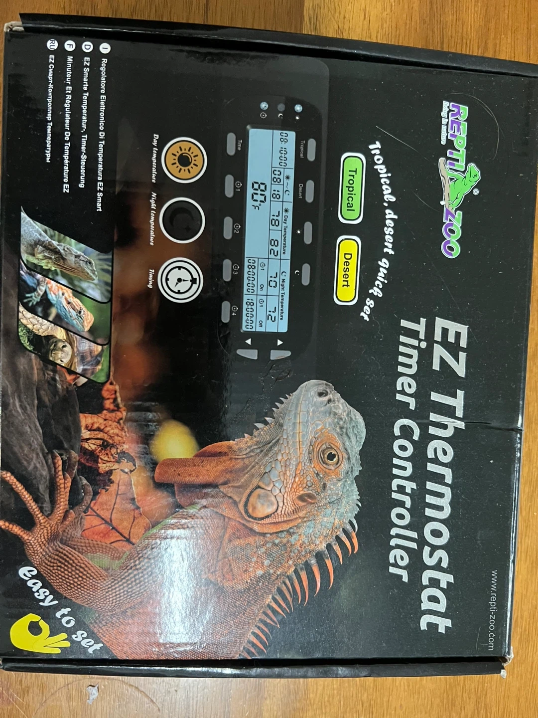Selling a REPTI ZOO EZ Thermostat Timer Controller. It's designed to easily control the temperature for tropical and desert setups. The controller features settings for both day and night temperatures, and it's easy to set up