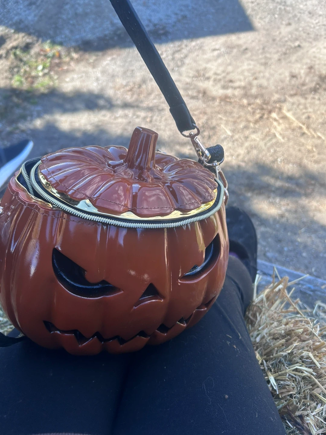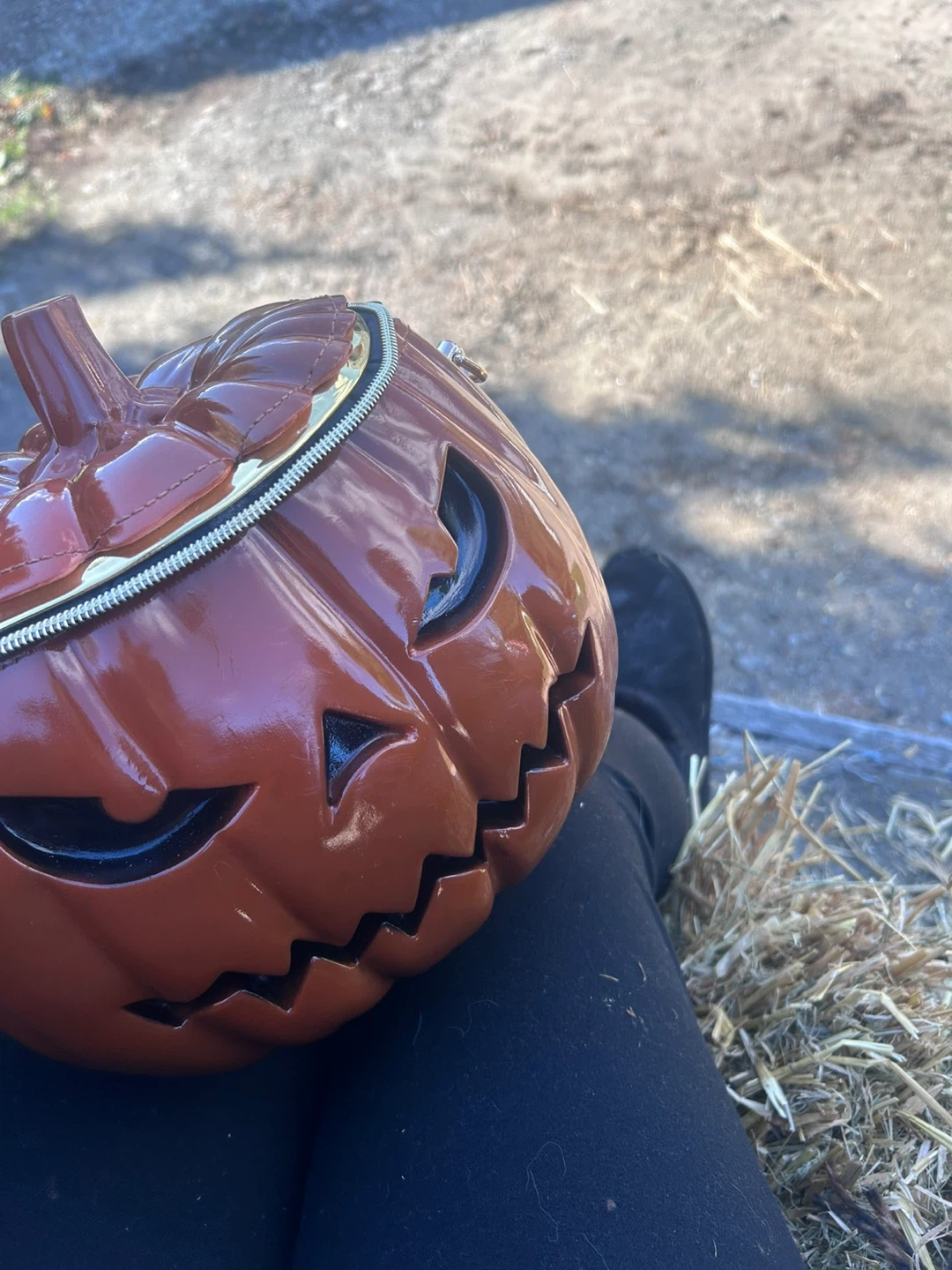 This is a super cute pumpkin purse, perfect for Halloween! It's in great condition and ready for a new owner. It has a zipper closure and a shoulder strap