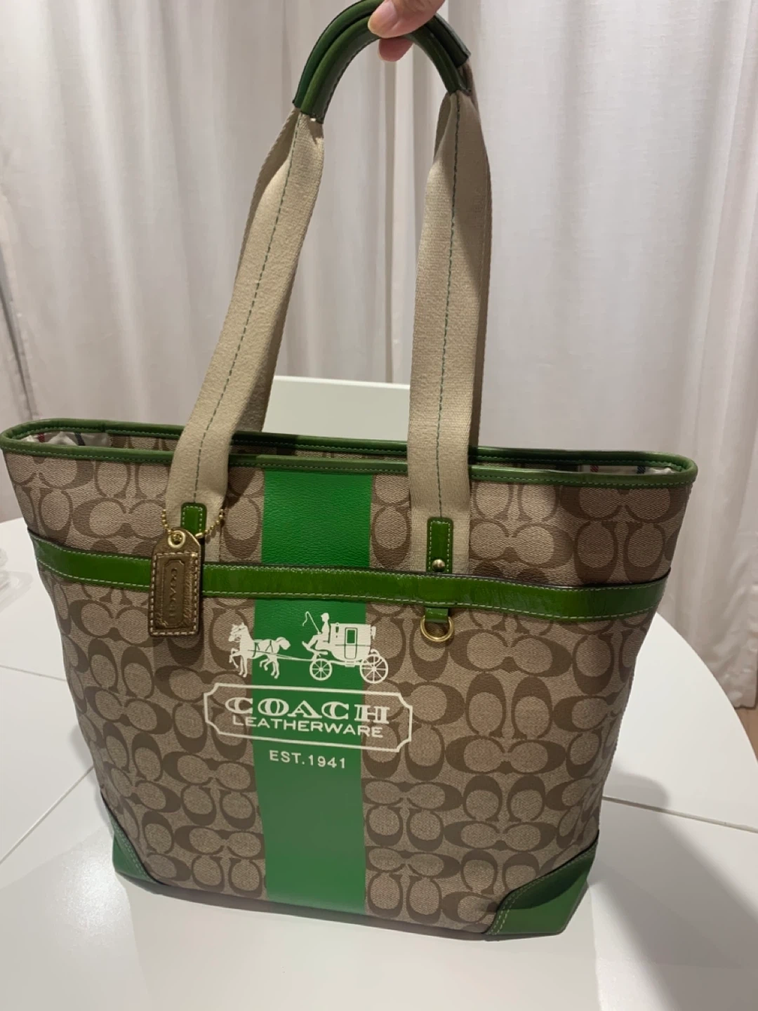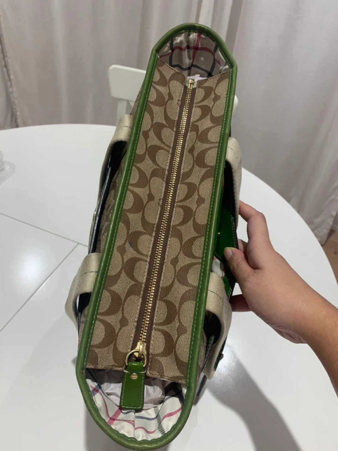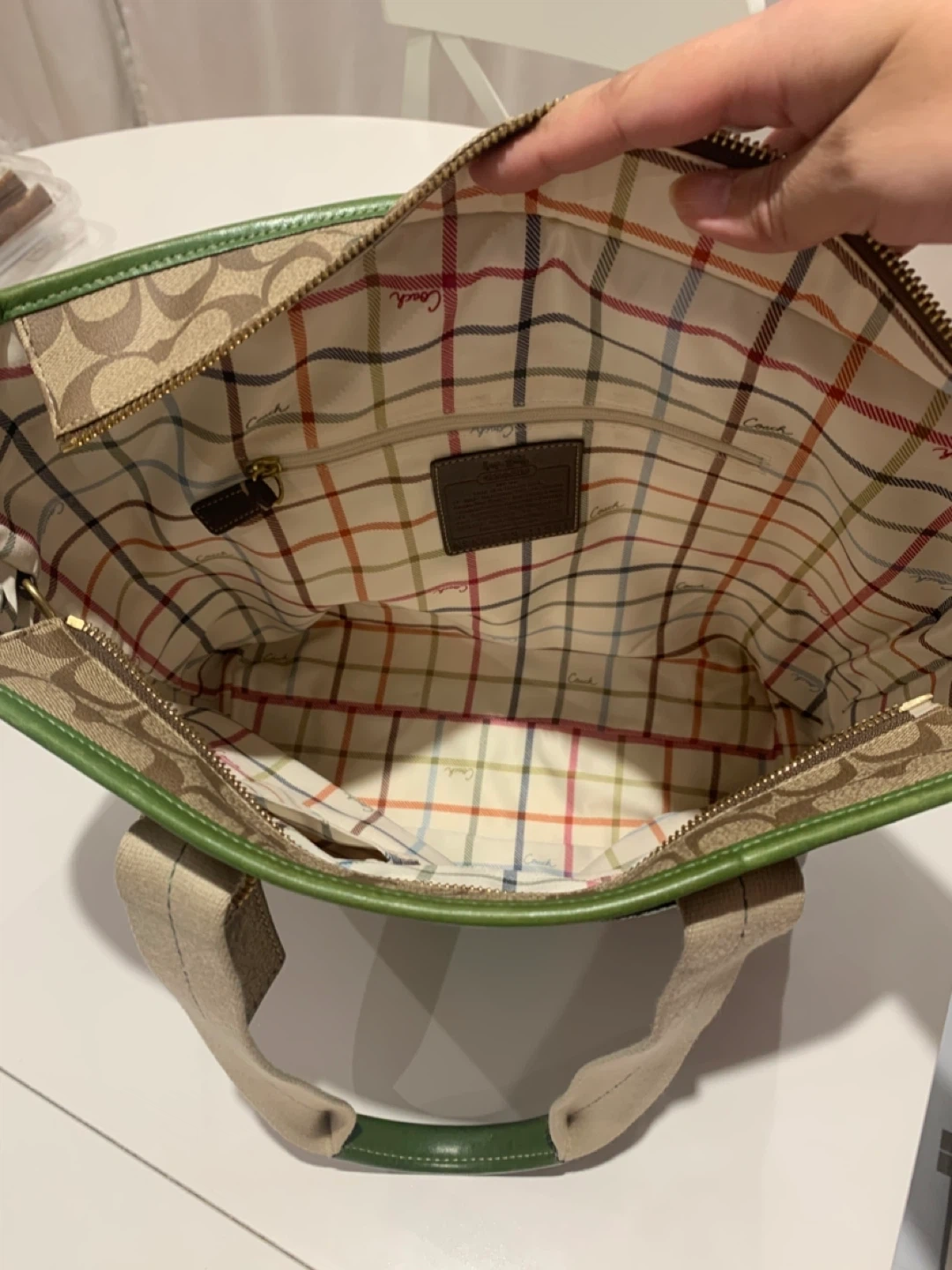 Selling a Coach Leatherware tote bag. It has a brown and beige patterned exterior with green leather trim. The interior lining has a colourful plaid pattern. There are some signs of wear on the green leather corners, but otherwise in good condition!