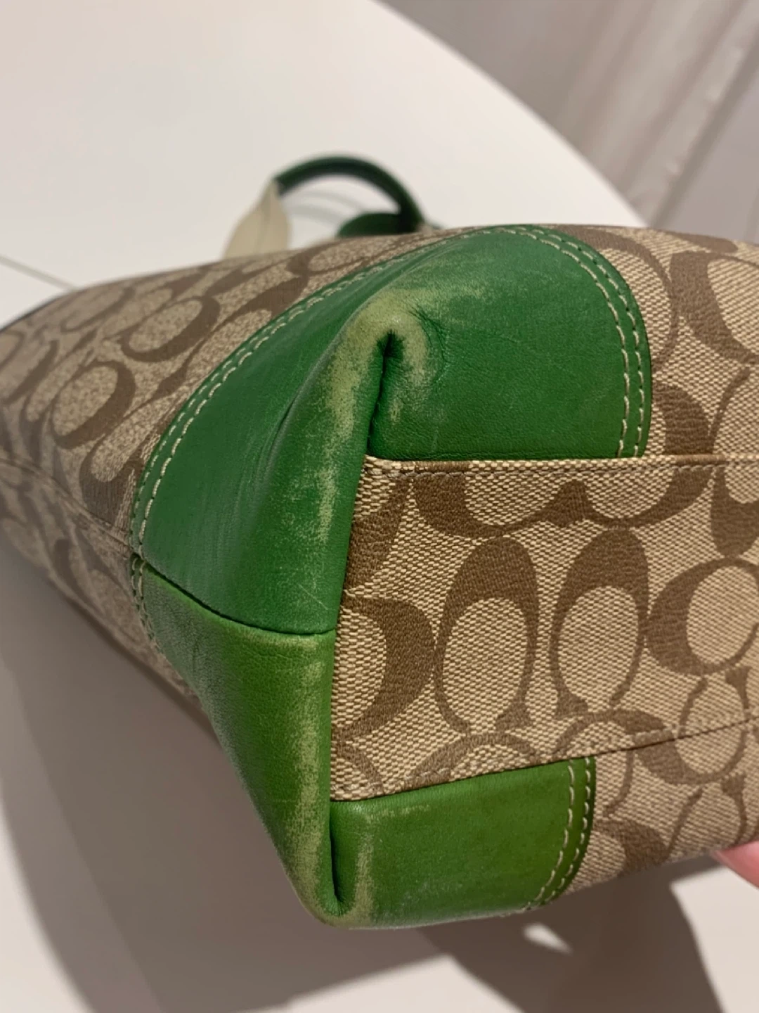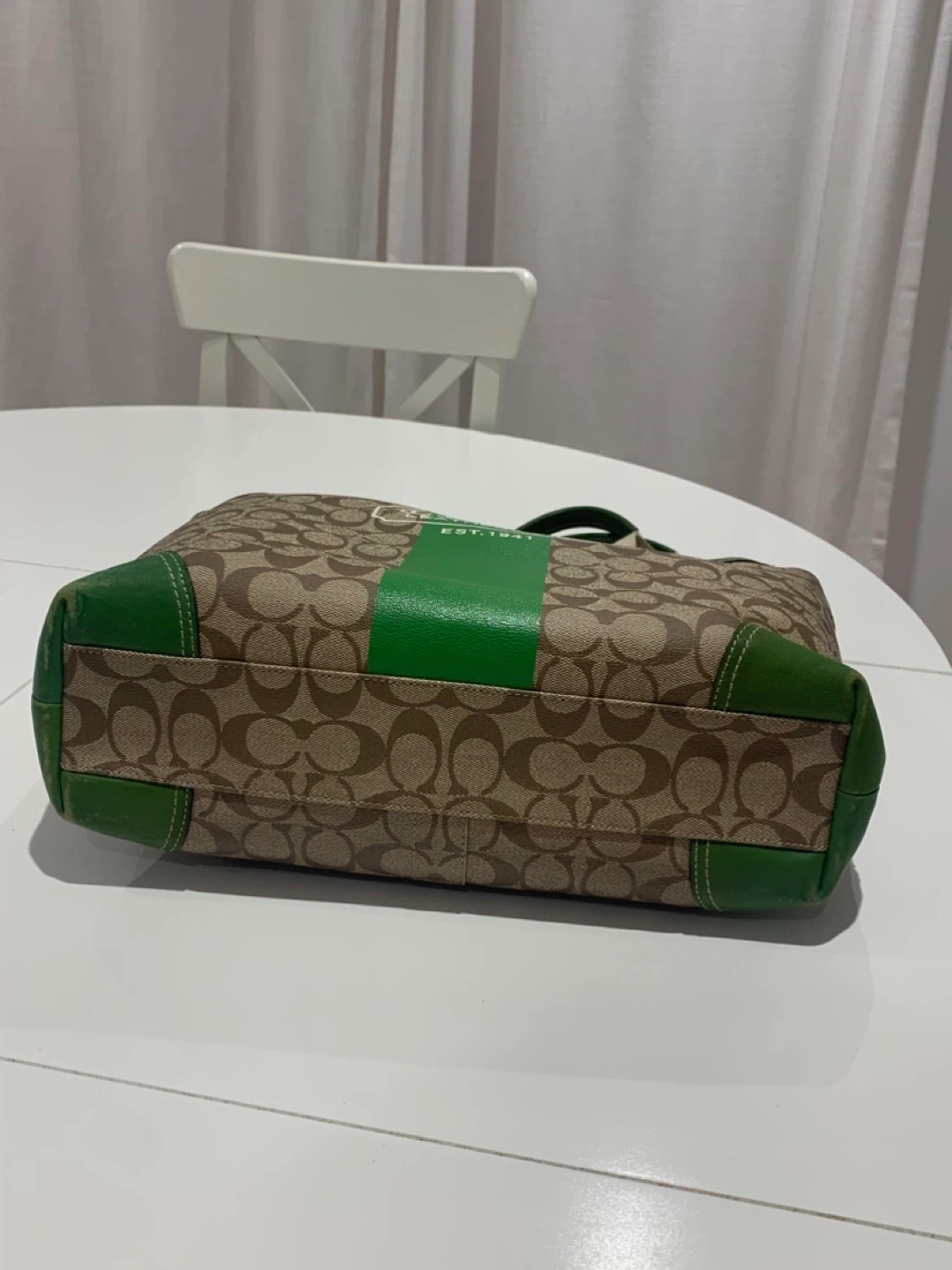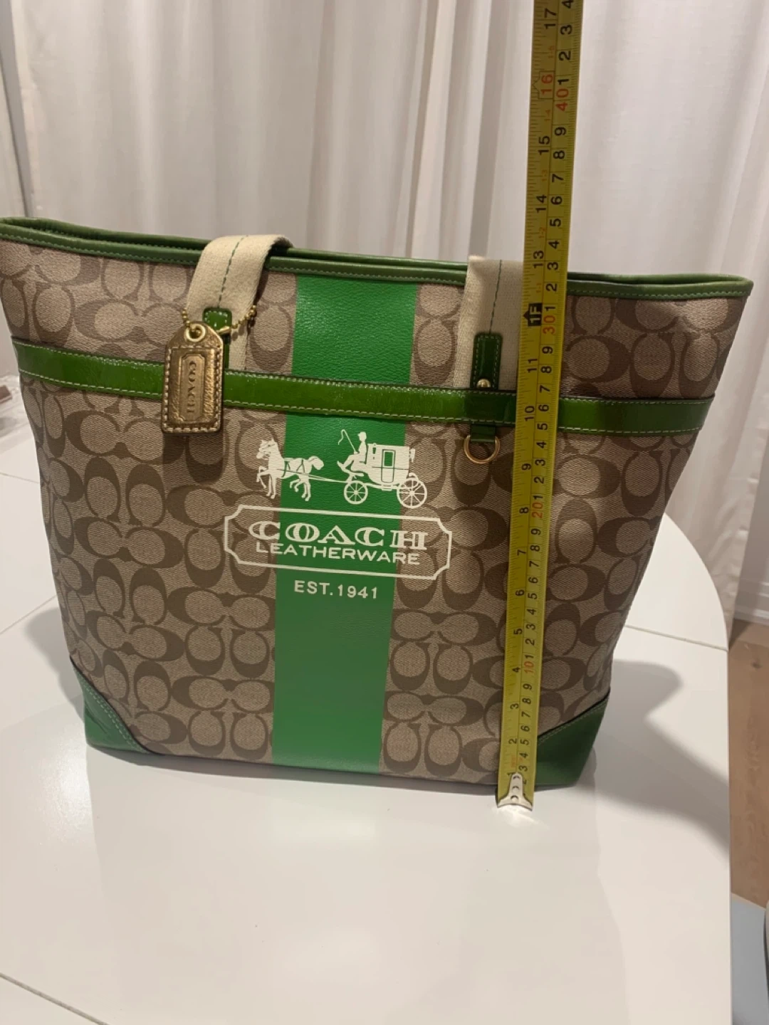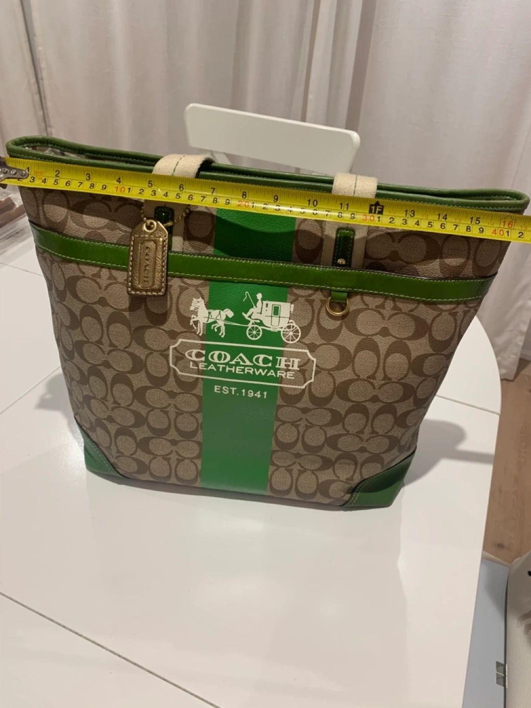 Selling a Coach Leatherware tote bag. It has a brown and beige patterned exterior with green leather trim. The interior lining has a colourful plaid pattern. There are some signs of wear on the green leather corners, but otherwise in good condition!