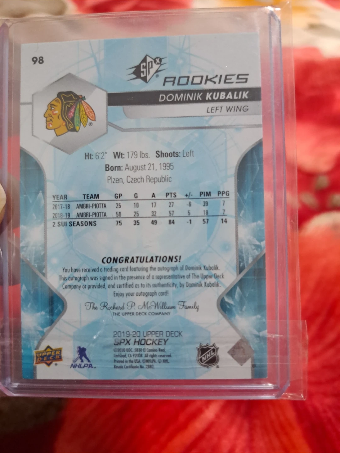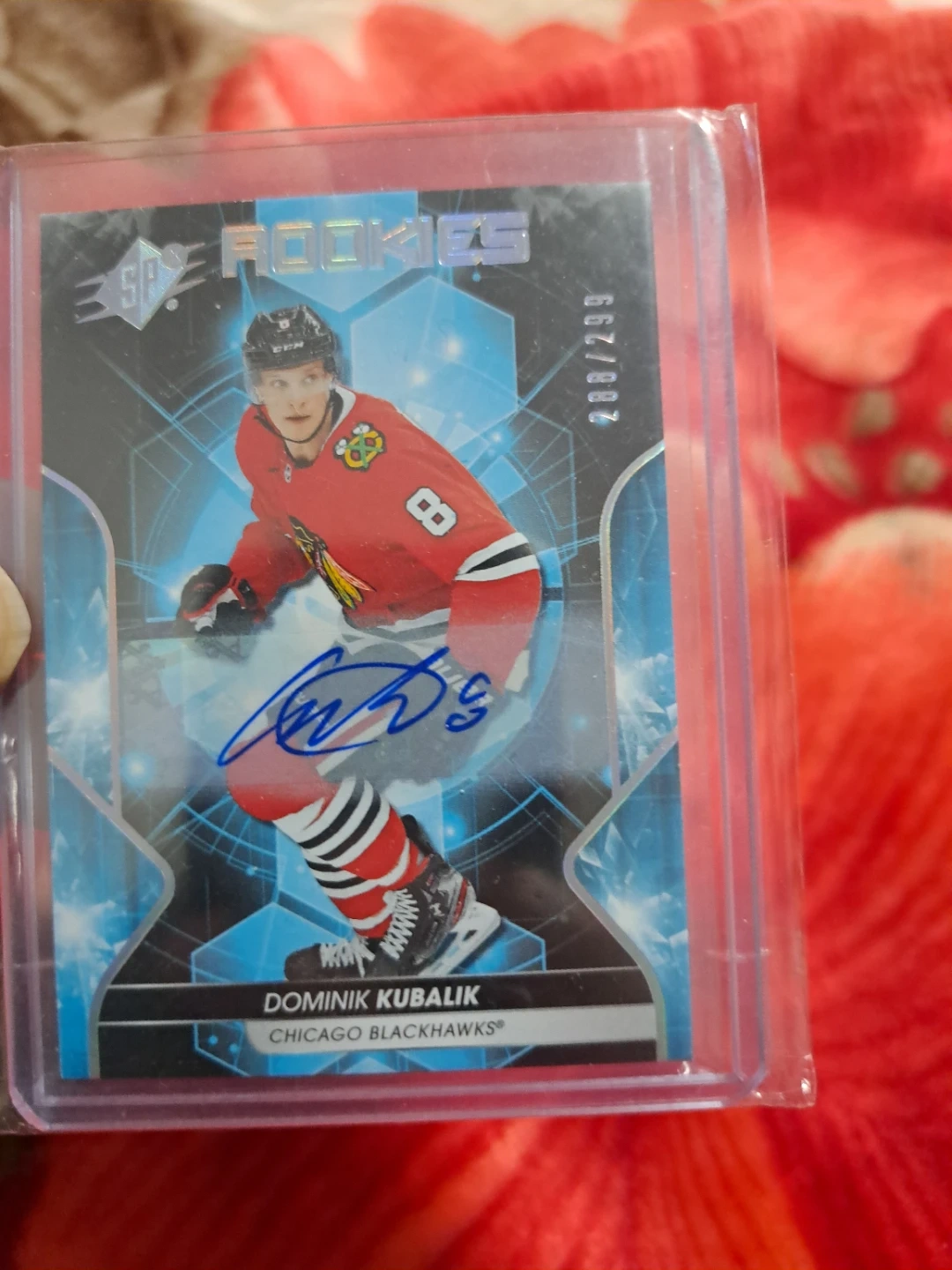 Selling a Dominik Kubalik SPx Rookie card, autographed! The card is from the Chicago Blackhawks. It's a limited edition, numbered 288/299. A great addition for any hockey card collector!