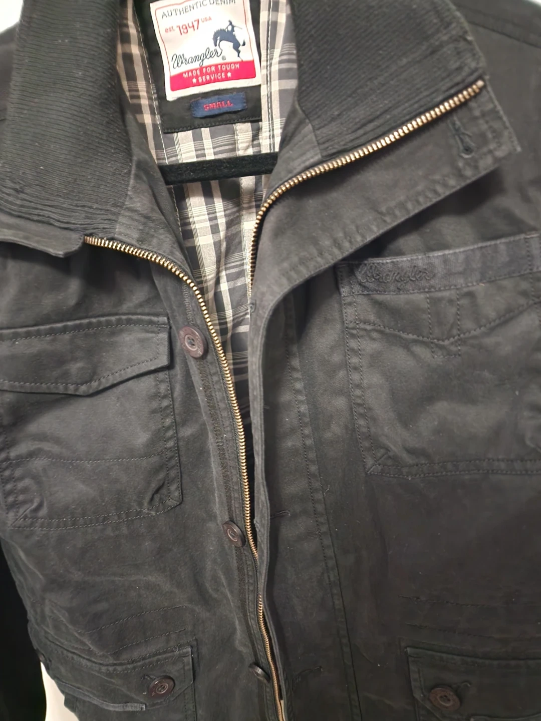 Here's a Wrangler Authentic Denim jacket in size small. It's a stylish jacket with a classic look. Perfect for everyday wear!