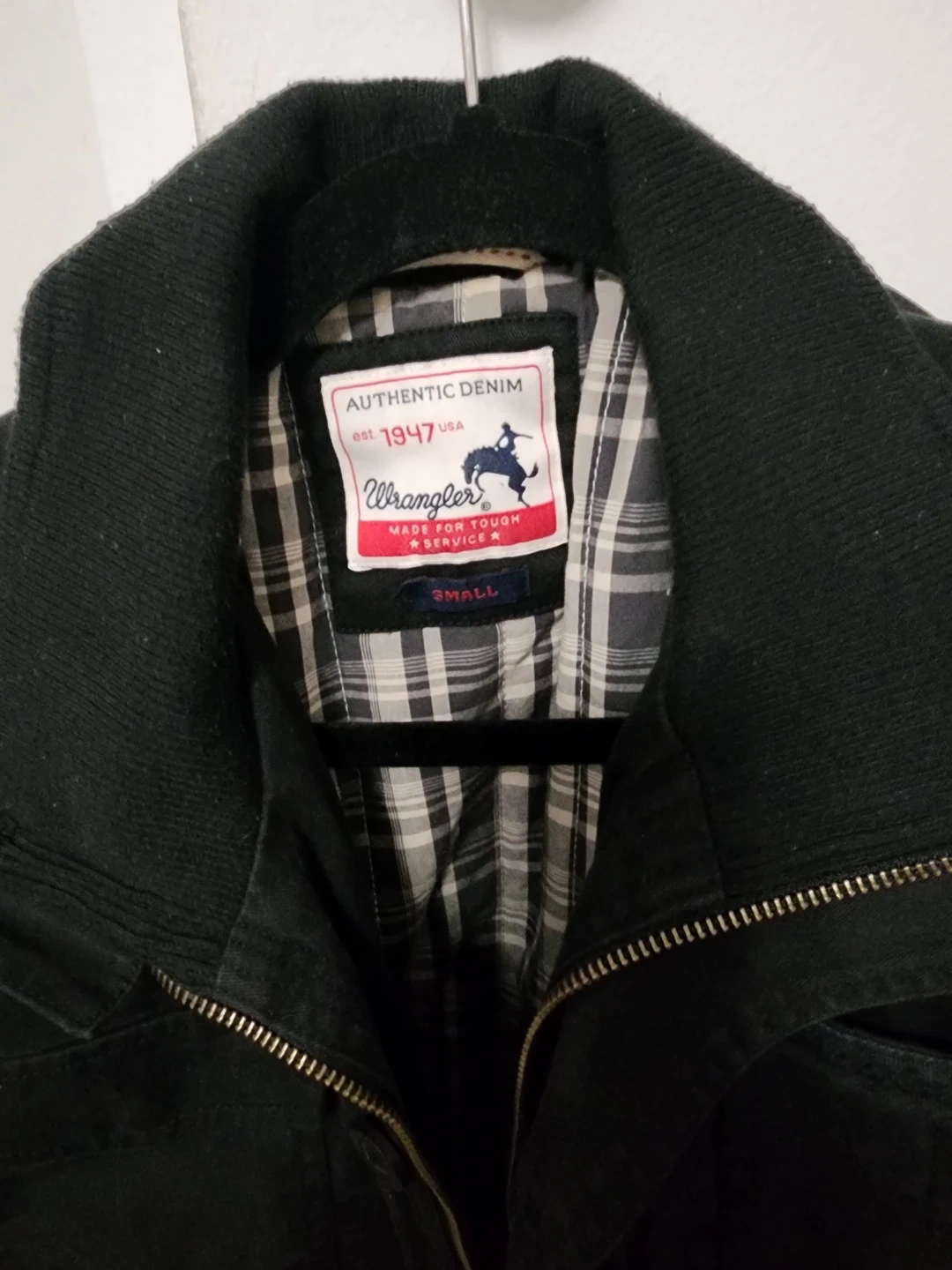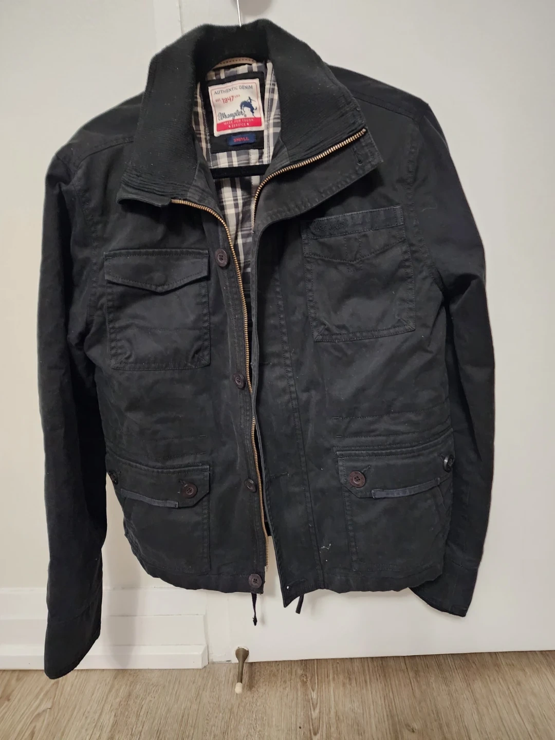 Here's a Wrangler Authentic Denim jacket in size small. It's a stylish jacket with a classic look. Perfect for everyday wear!