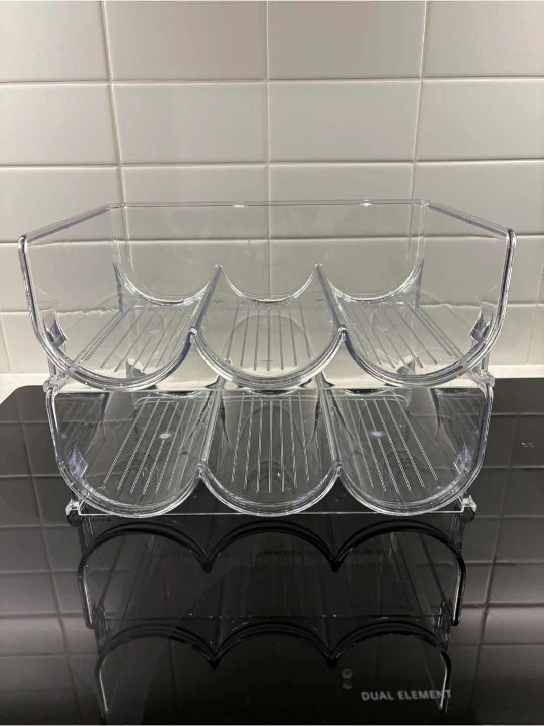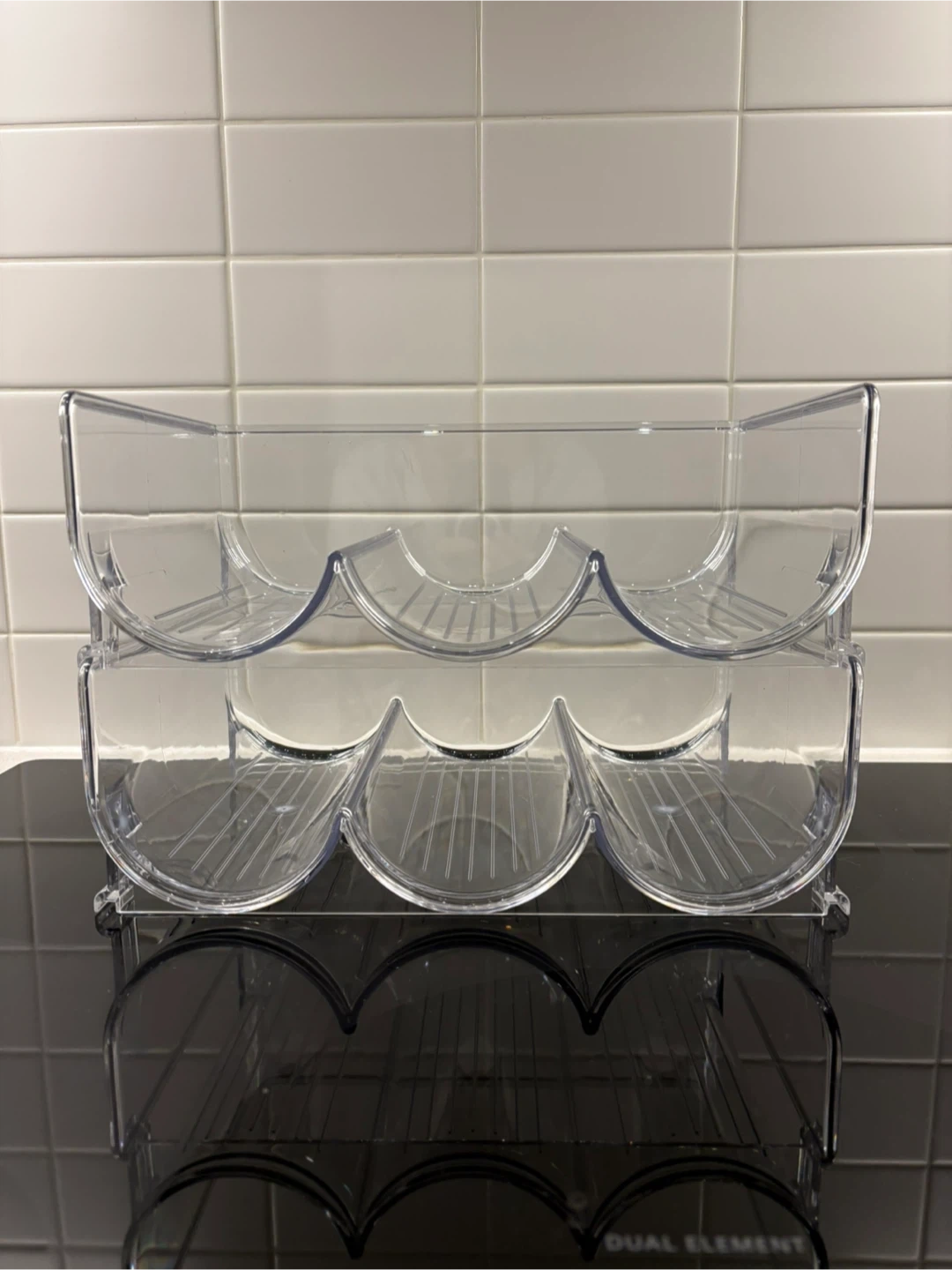 Selling a clear, stackable bottle rack organizer! It's in like new condition and perfect for keeping your water bottles, or any bottles , neatly stored. It can also be used for other bottled beverages. It can be used stacked or separated . It holds 6 bottles in total . Originally paid 33$. Selling for 10$