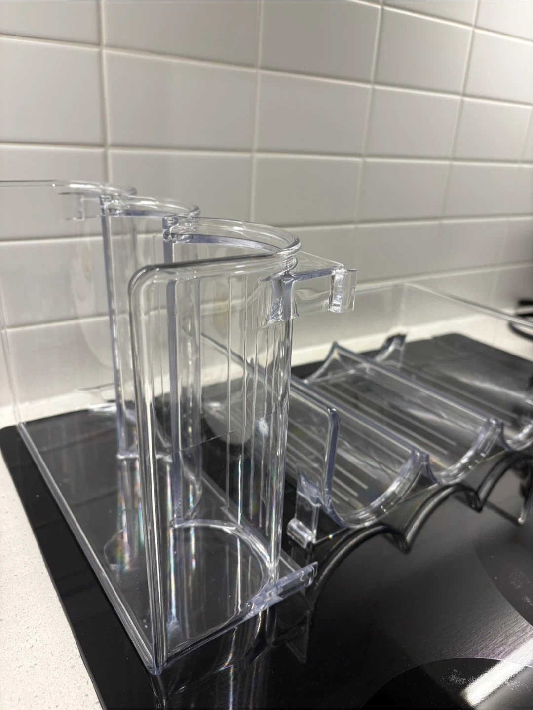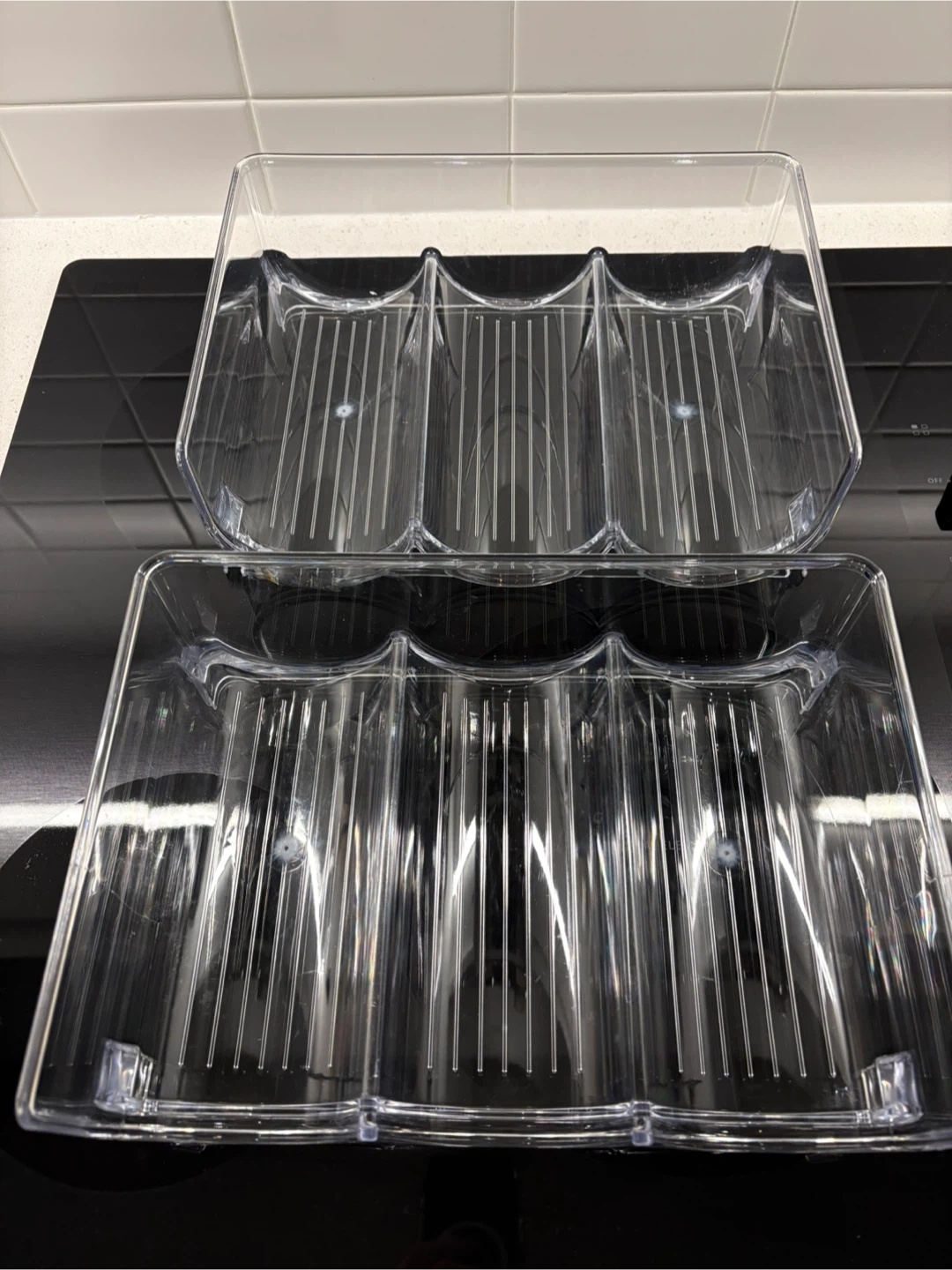 Selling a clear, stackable bottle rack organizer! It's in like new condition and perfect for keeping your water bottles, or any bottles , neatly stored. It can also be used for other bottled beverages. It can be used stacked or separated . It holds 6 bottles in total . Originally paid 33$. Selling for 10$