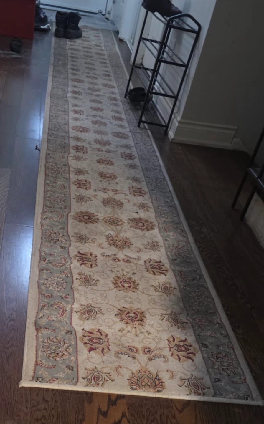 Here's a runner rug with a floral pattern, perfect for a hallway or entryway. It adds a touch of elegance to any space. In great condition and ready for a new home! No stains no damages